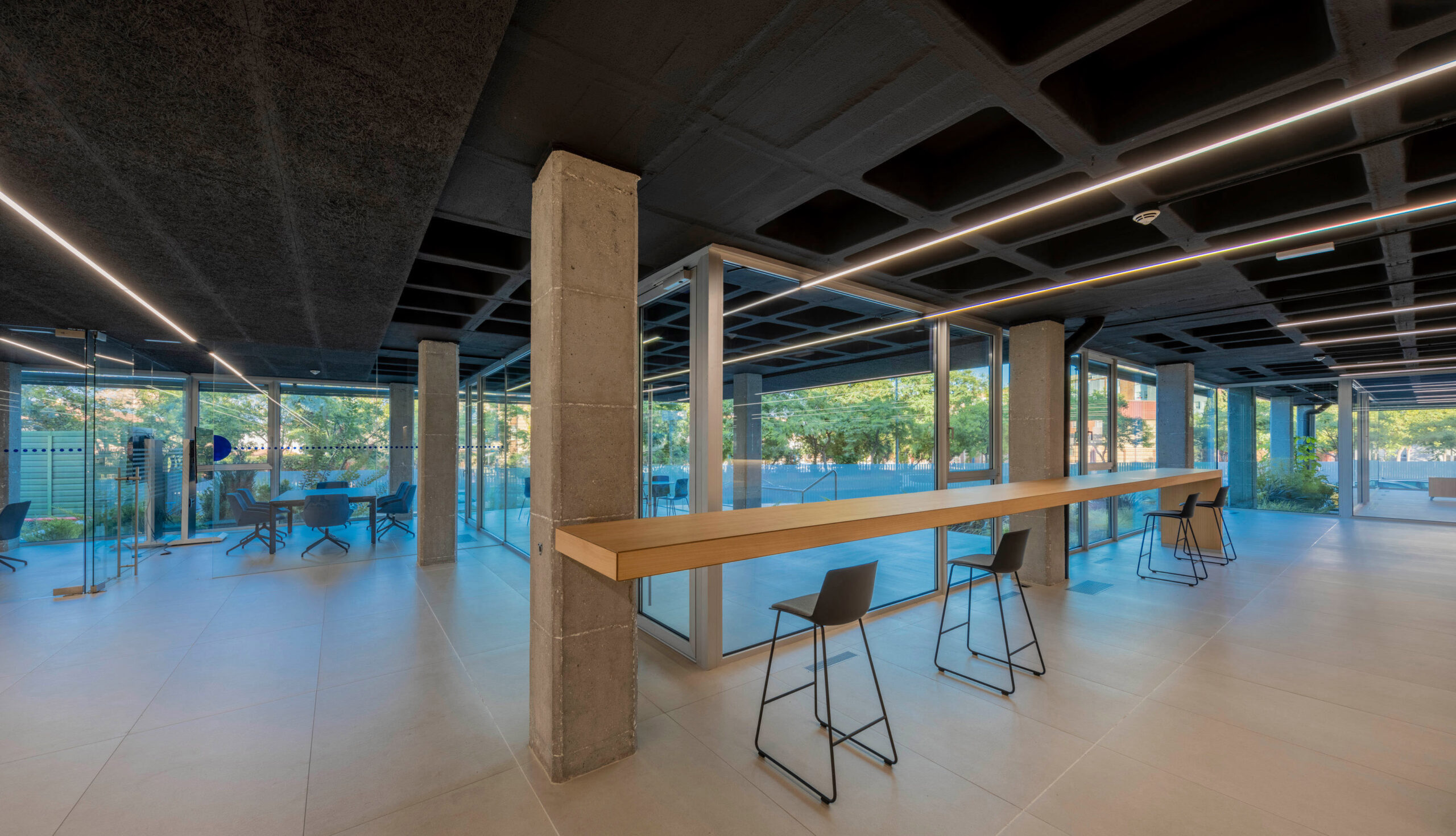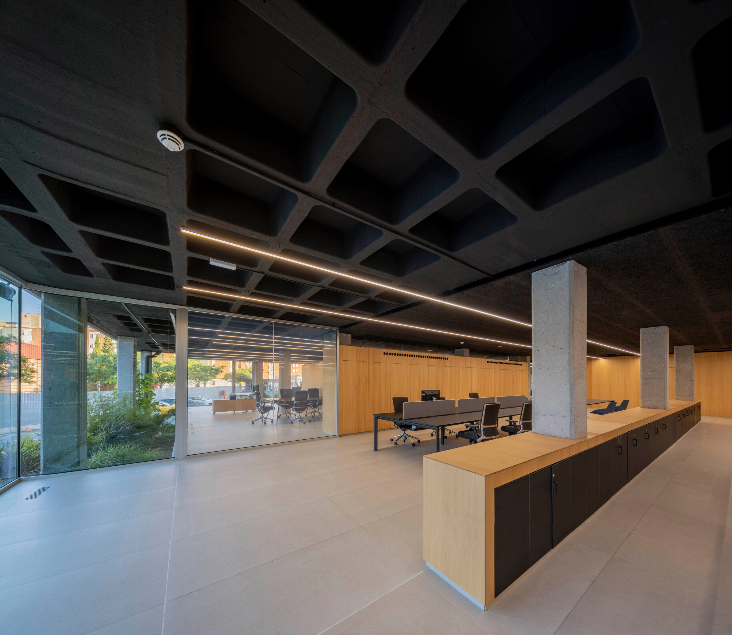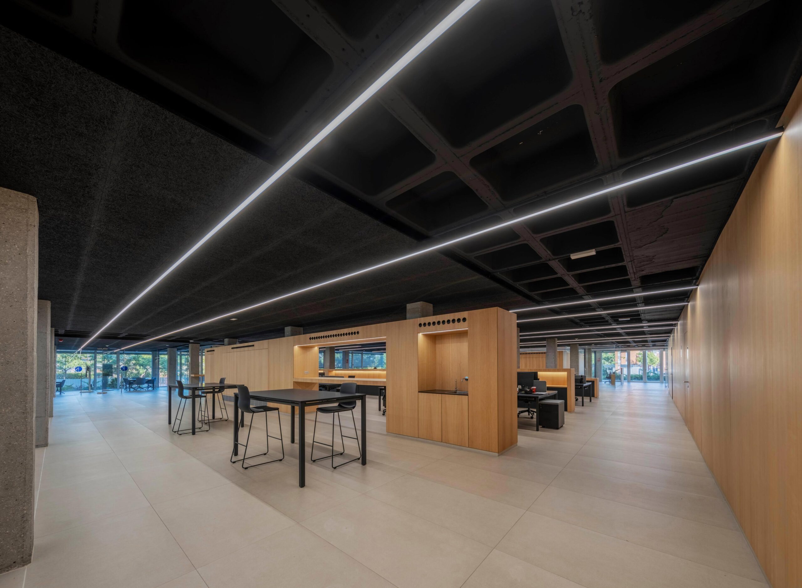 La propuesta fusiona naturalización y tecnología mediante una envolvente de madera y aluminio. El diseño integra el ciclo del agua en la arquitectura: el excedente del proceso industrial se recicla para abastecer el jardín vertical, la cubierta vegetal y los núcleos húmedos. Esta estrategia de economía circular visualiza el compromiso medioambiental de la marca a través del paisaje.
