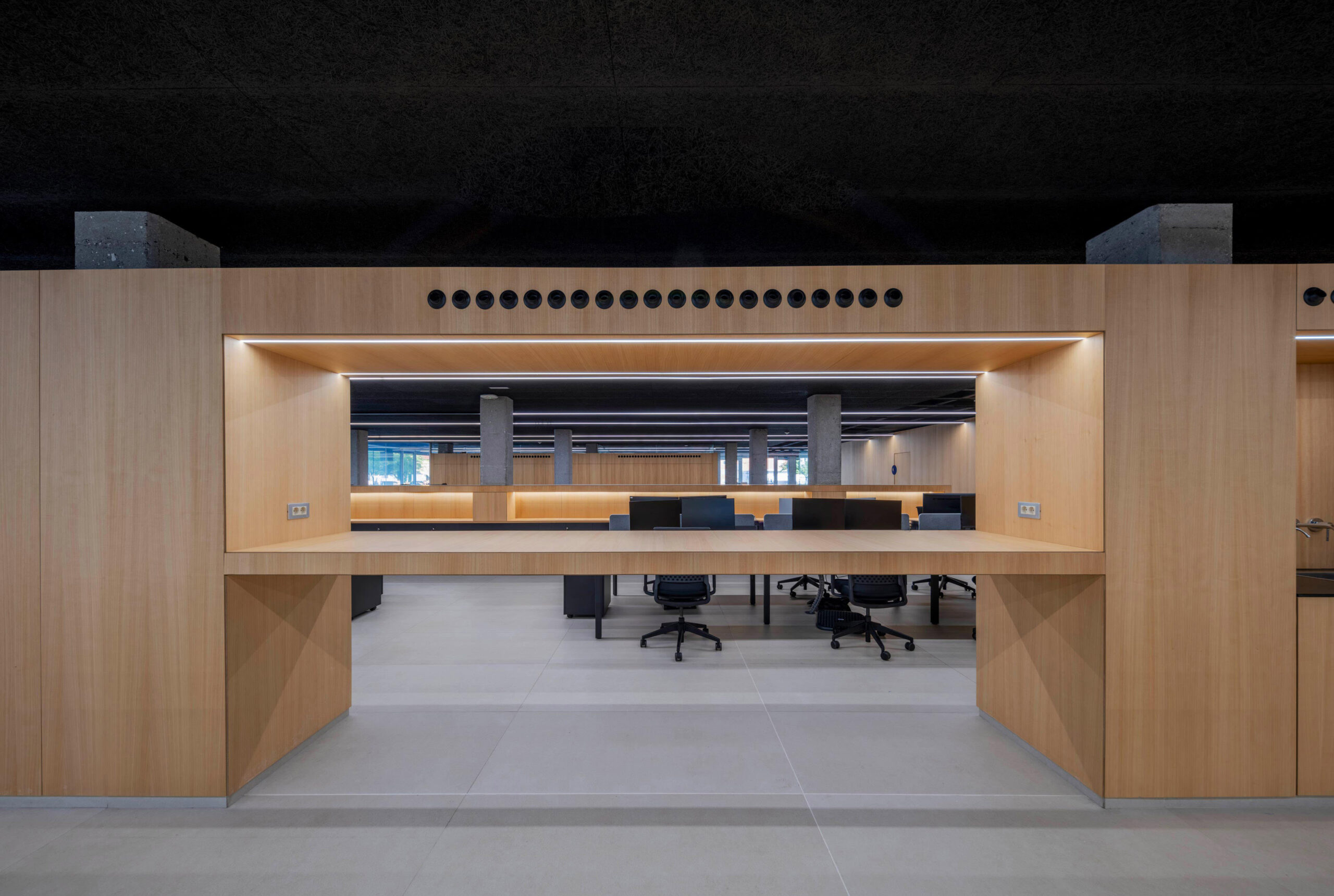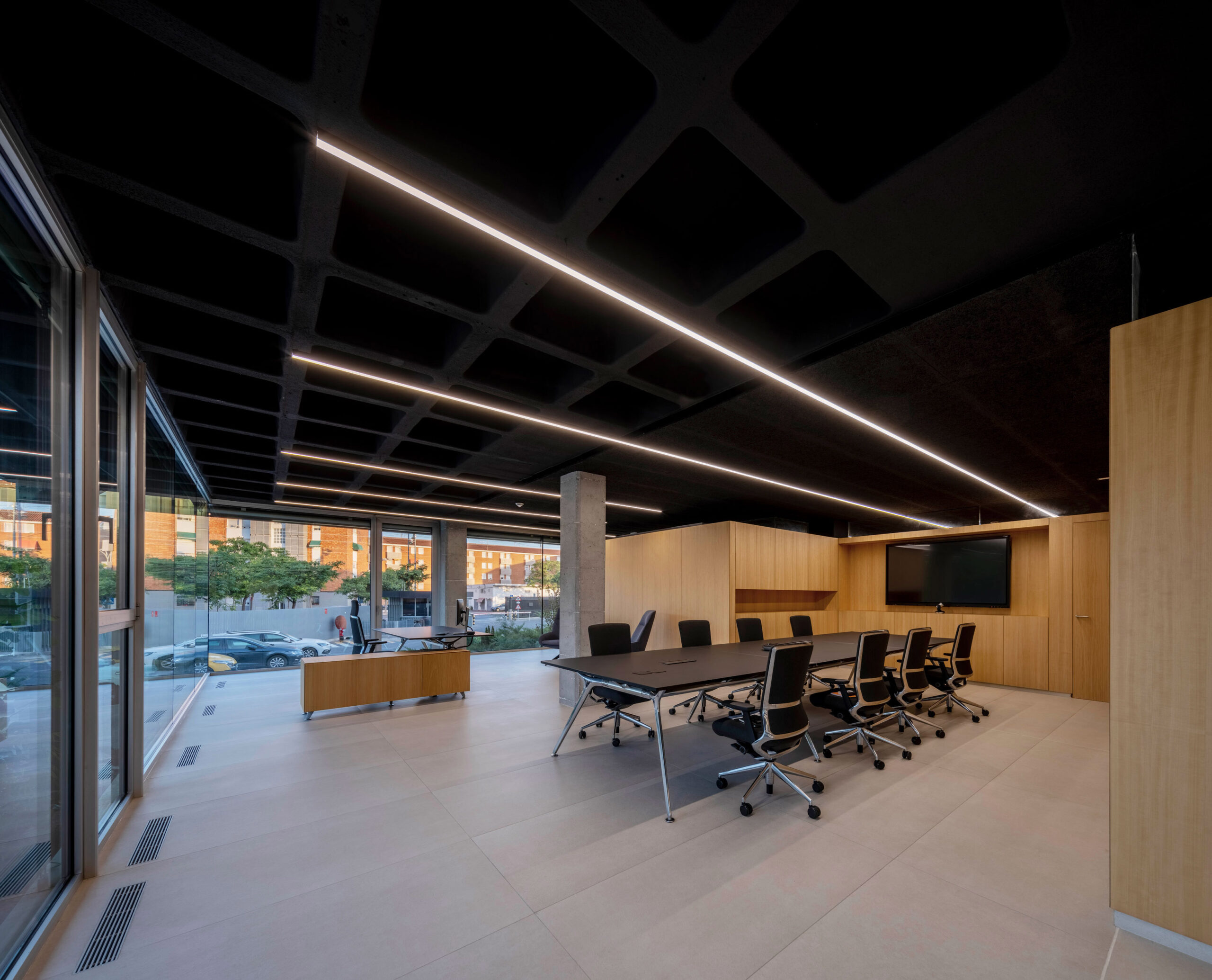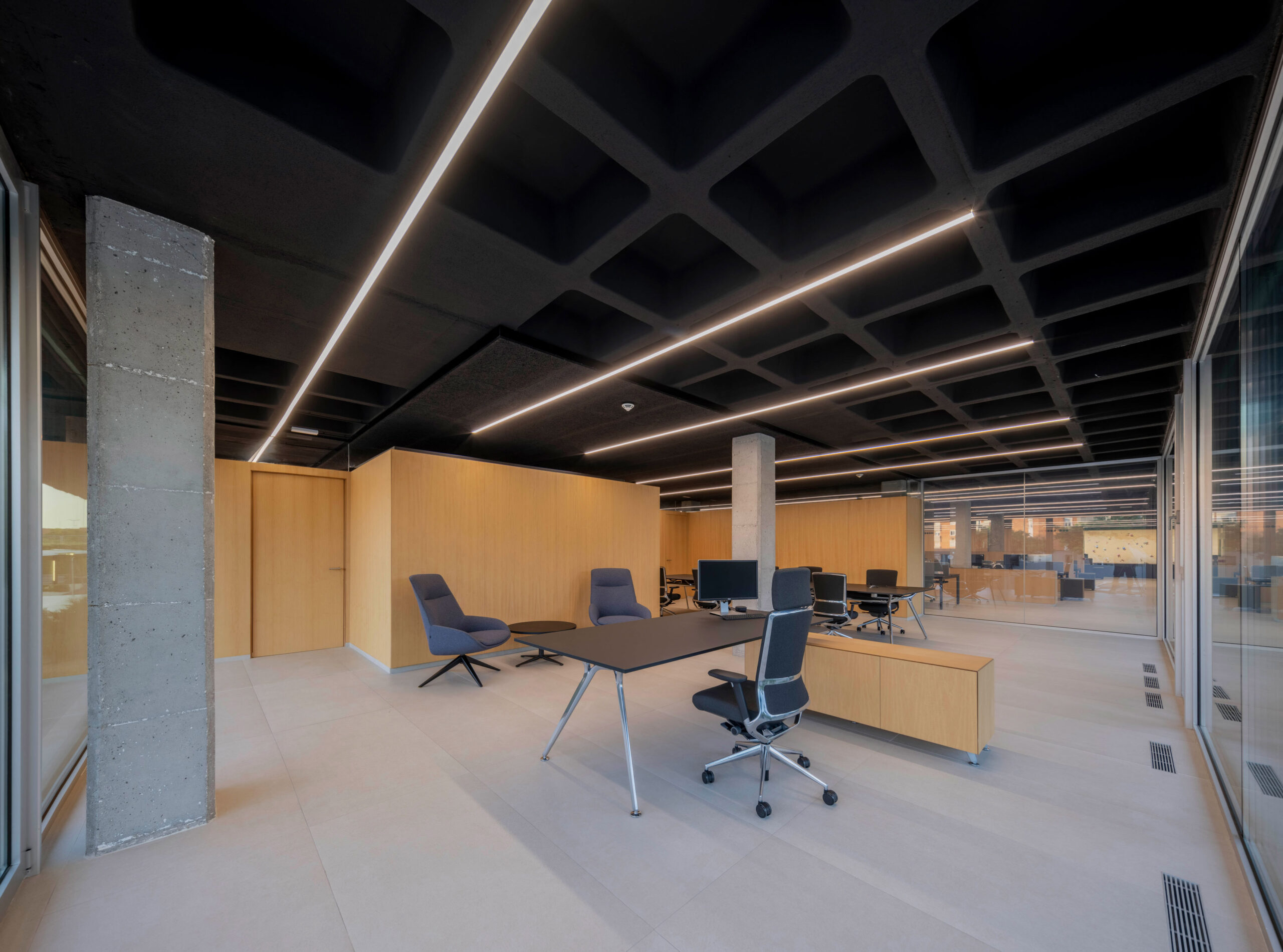 La propuesta fusiona naturalización y tecnología mediante una envolvente de madera y aluminio. El diseño integra el ciclo del agua en la arquitectura: el excedente del proceso industrial se recicla para abastecer el jardín vertical, la cubierta vegetal y los núcleos húmedos. Esta estrategia de economía circular visualiza el compromiso medioambiental de la marca a través del paisaje.