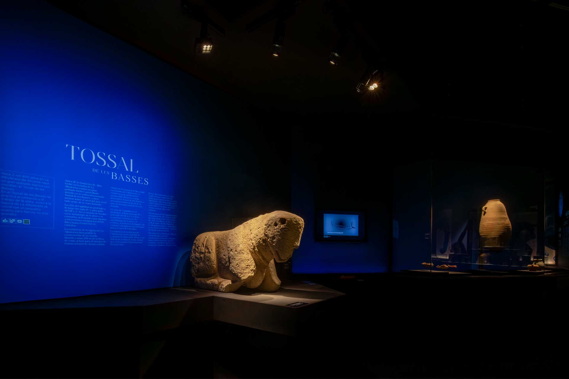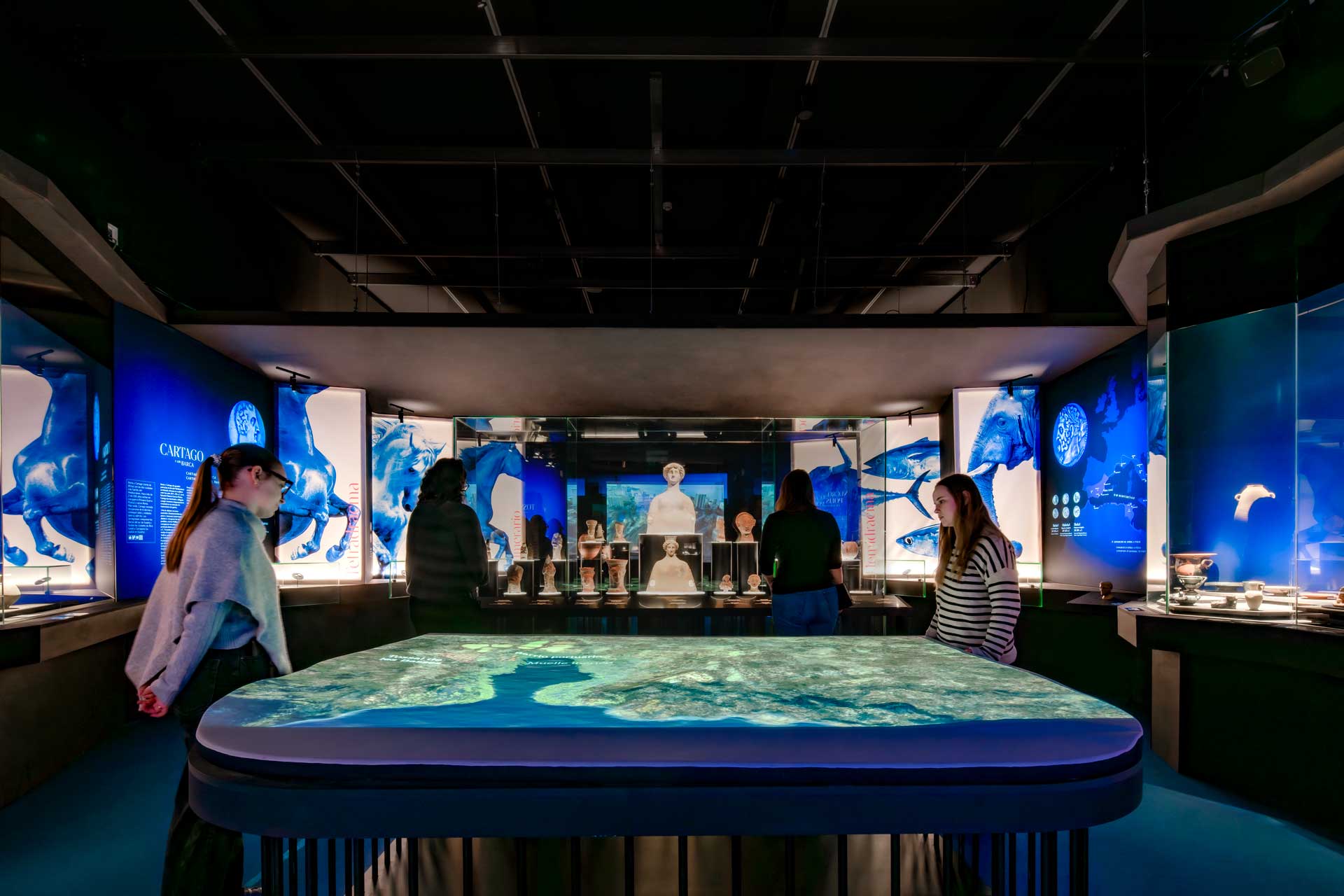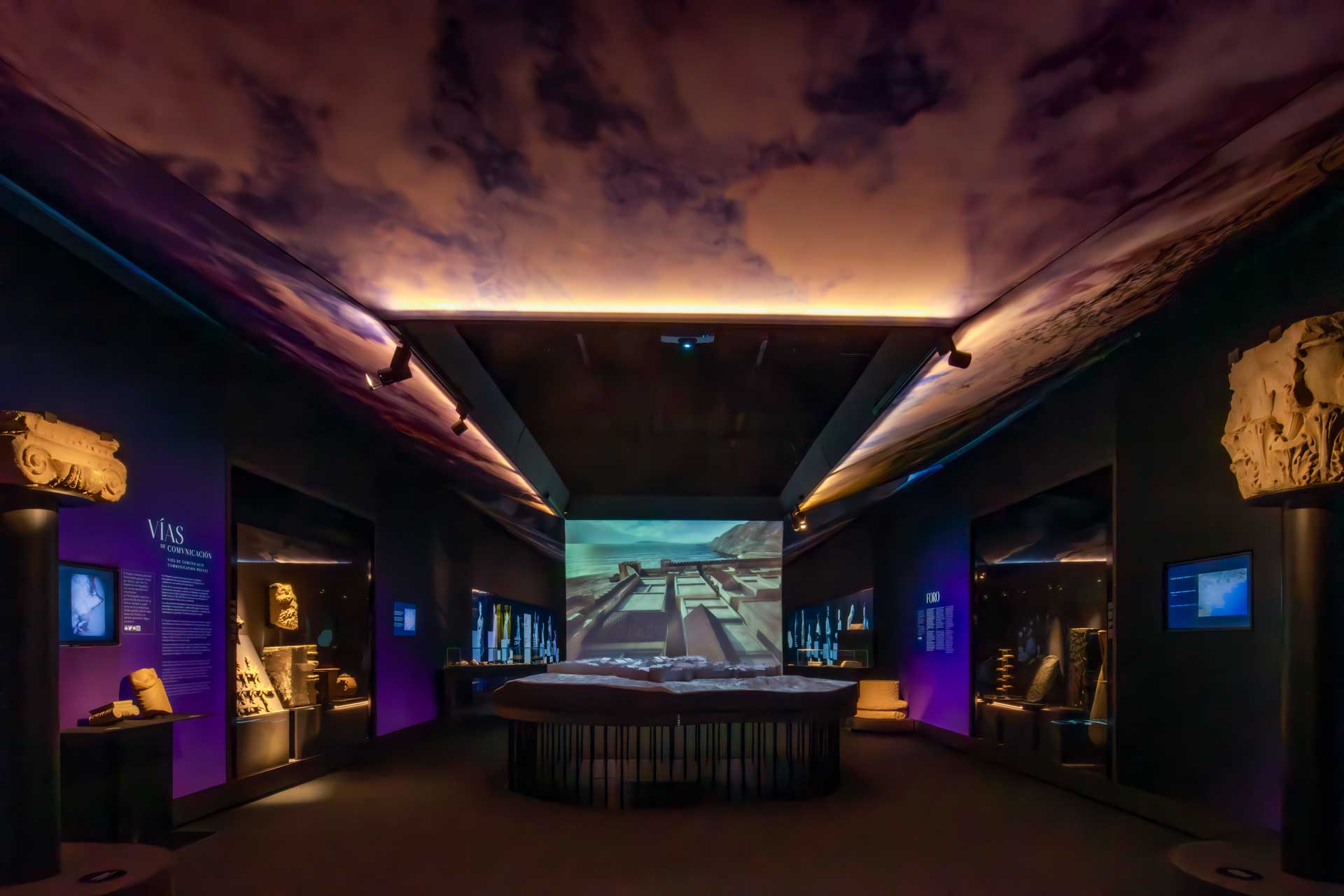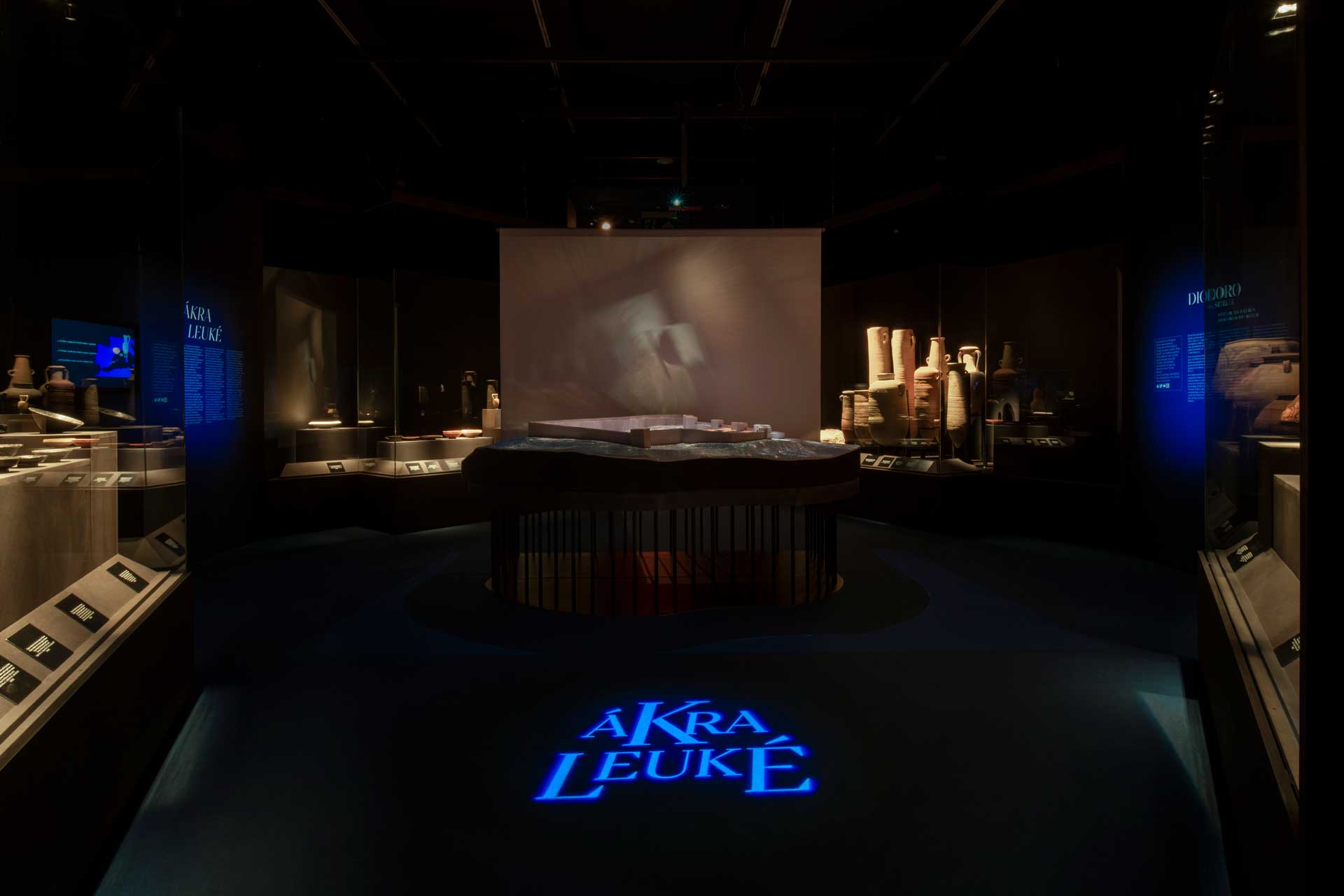 La sala 1 aborda Ákra Leuké, ciudad cartaginesa de importancia comercial y militar, con vitrinas modulares, proyecciones cartográficas y gráficos retroiluminados que evocan el entorno y las conexiones mediterráneas.