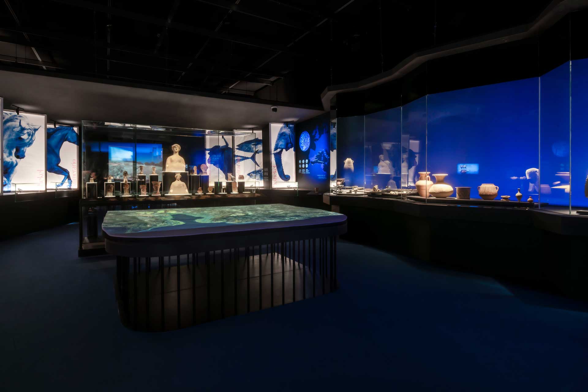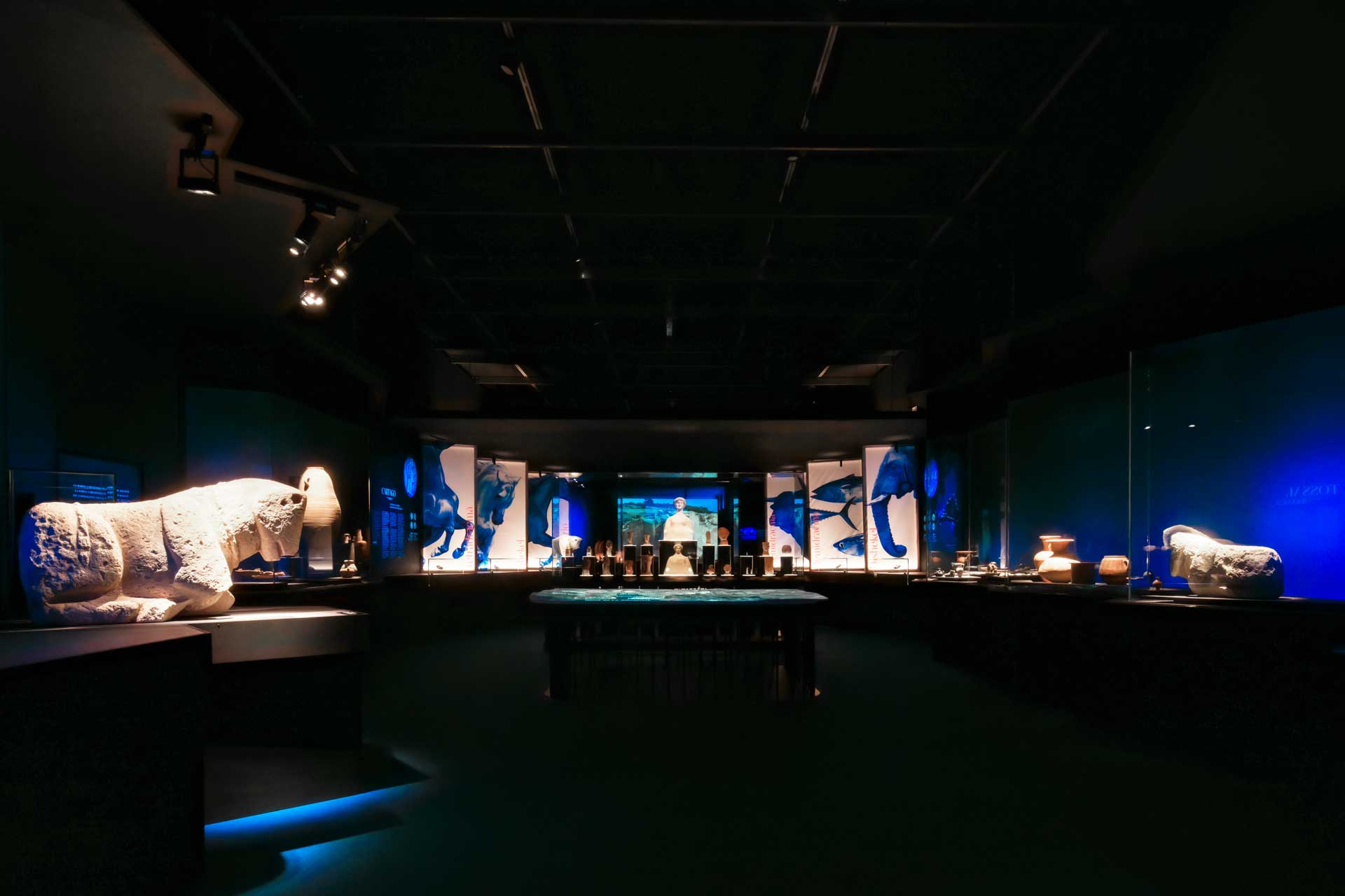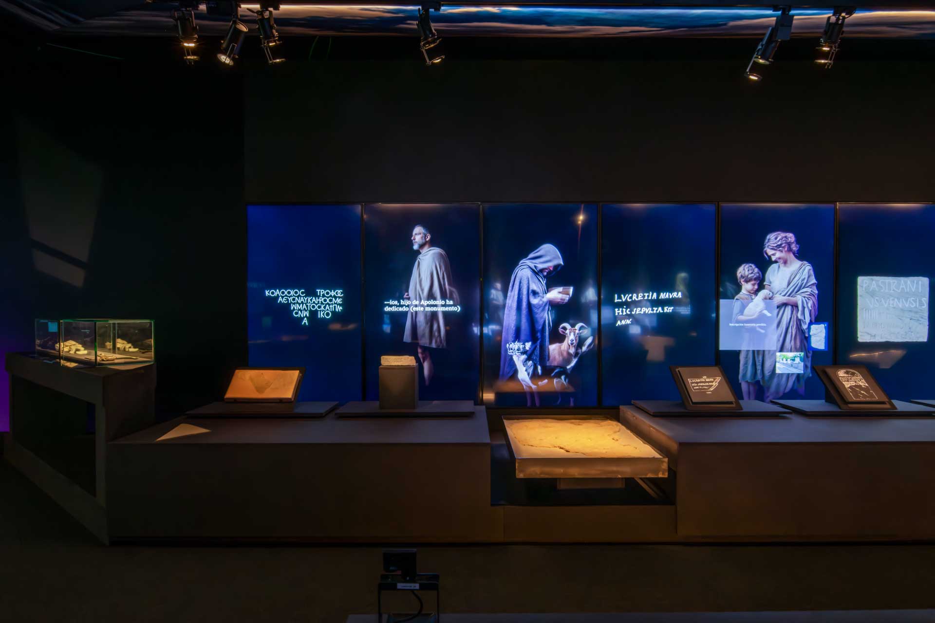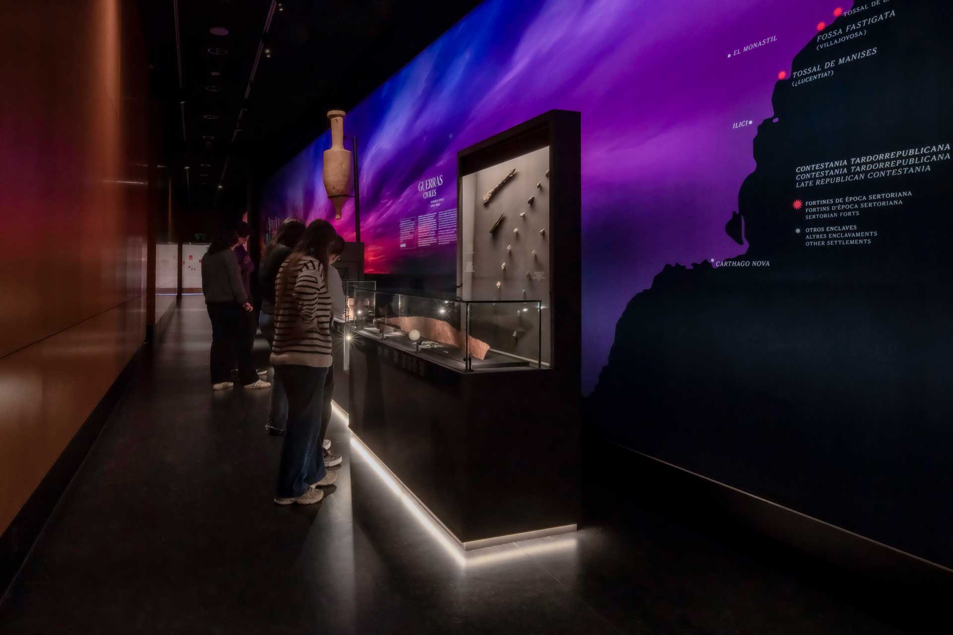 La sala 1 aborda Ákra Leuké, ciudad cartaginesa de importancia comercial y militar, con vitrinas modulares, proyecciones cartográficas y gráficos retroiluminados que evocan el entorno y las conexiones mediterráneas.