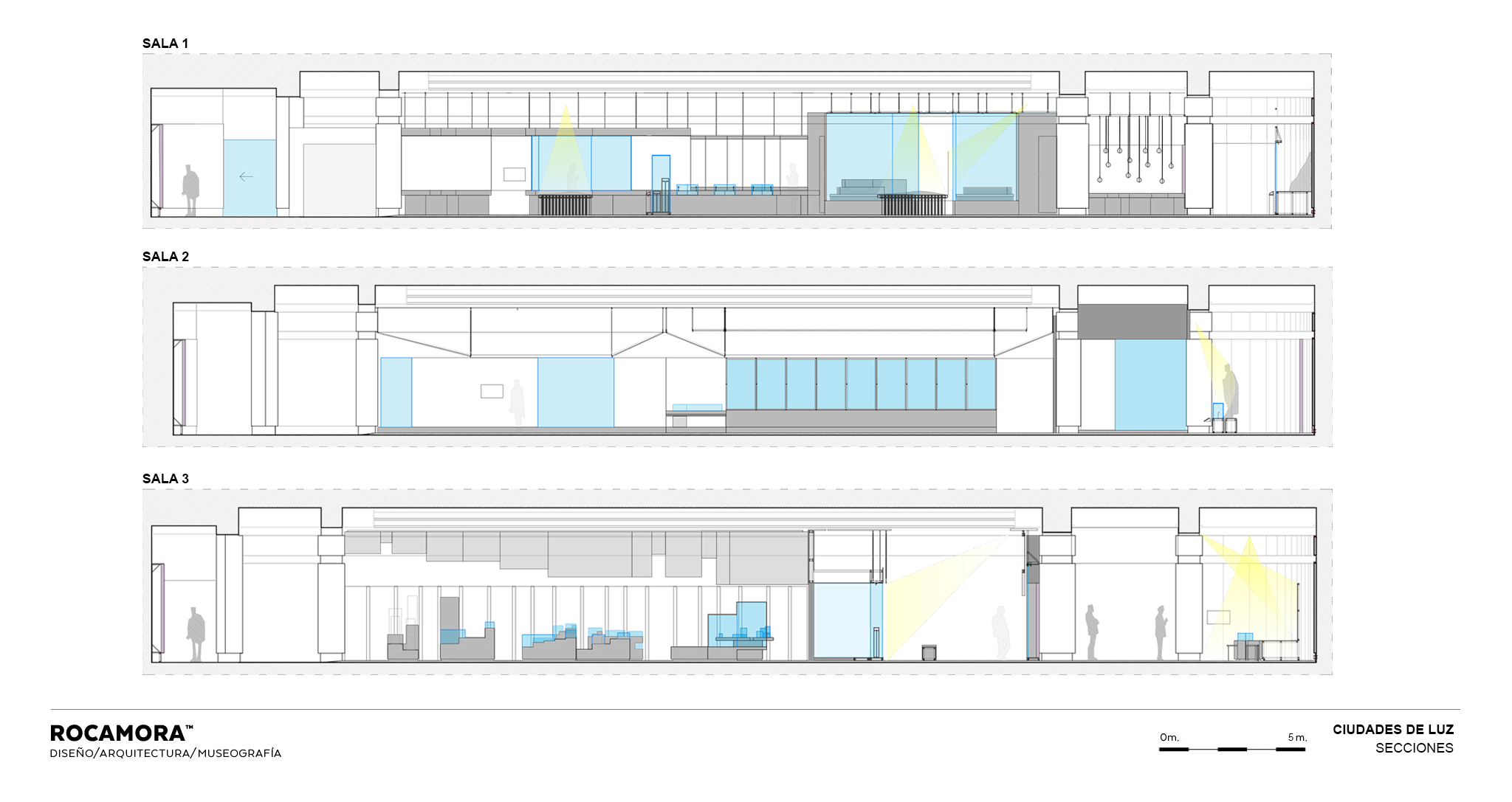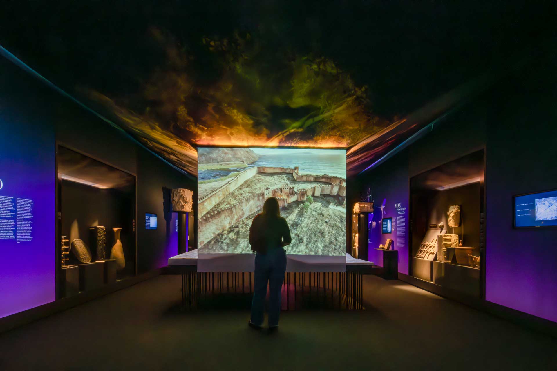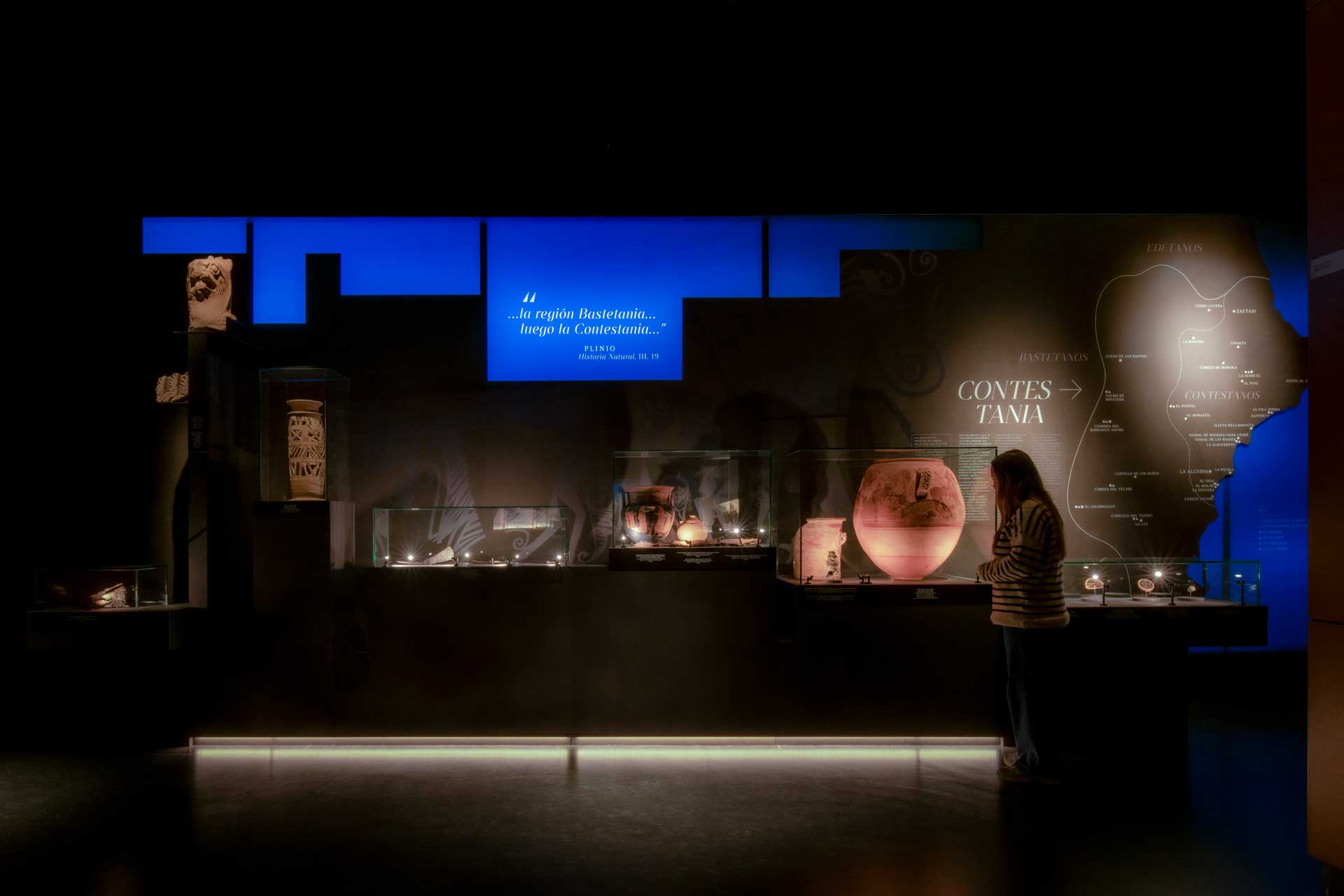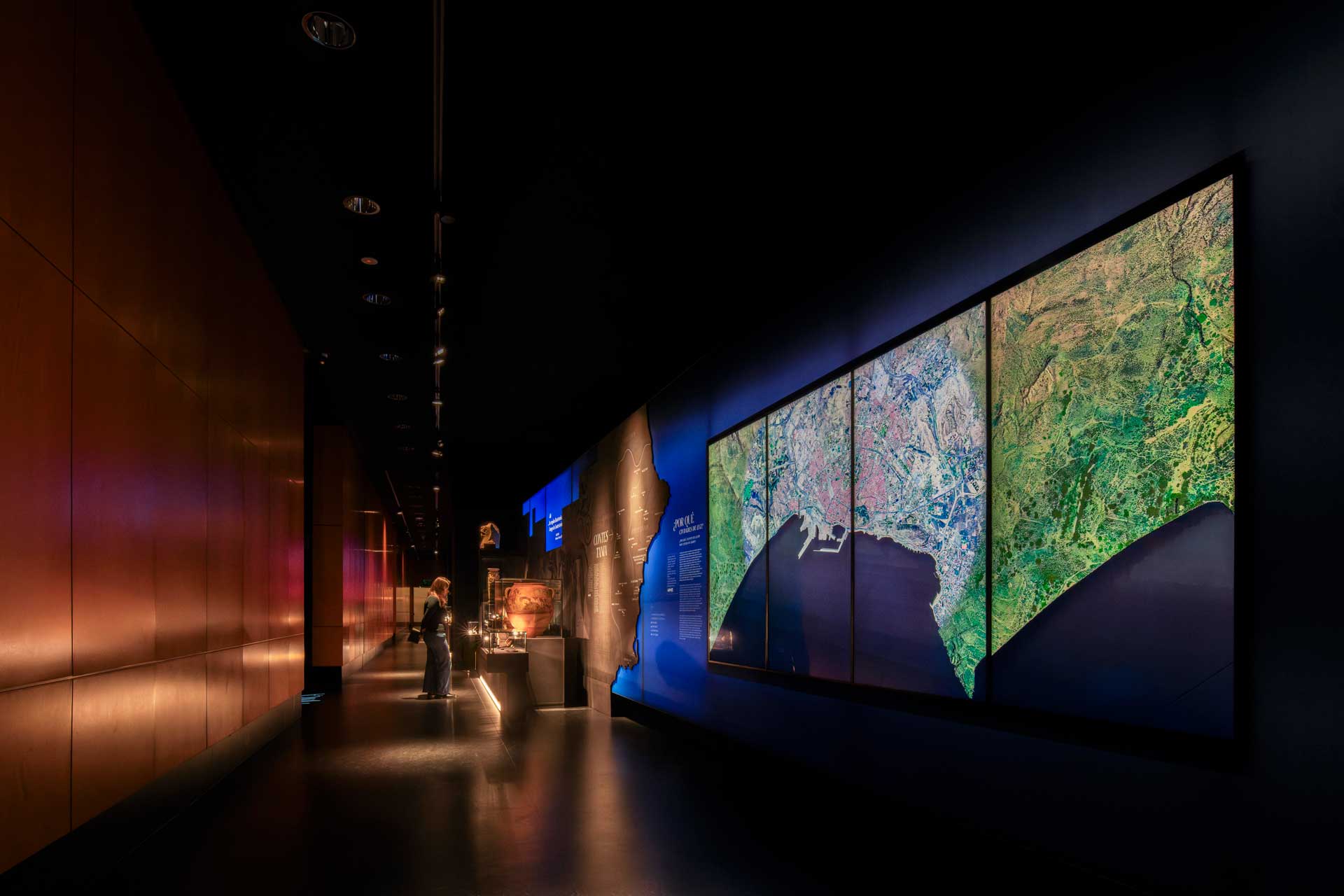 La sala 1 aborda Ákra Leuké, ciudad cartaginesa de importancia comercial y militar, con vitrinas modulares, proyecciones cartográficas y gráficos retroiluminados que evocan el entorno y las conexiones mediterráneas.