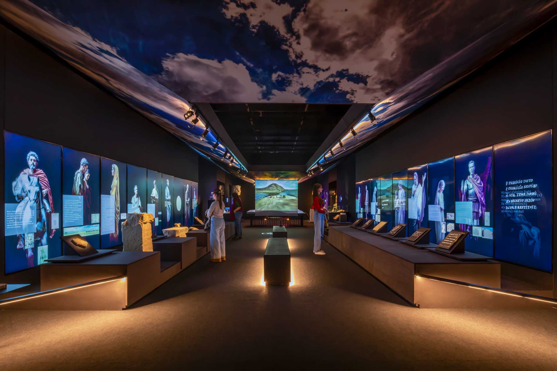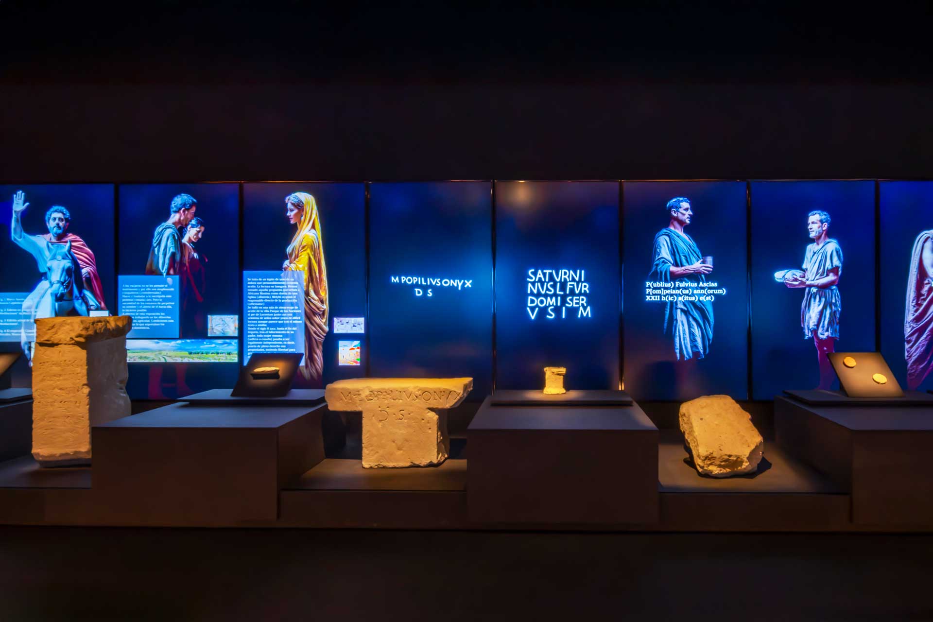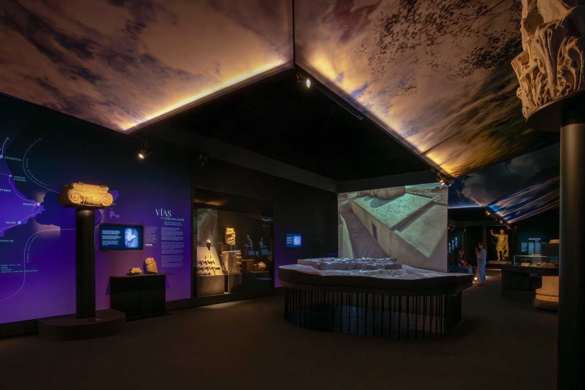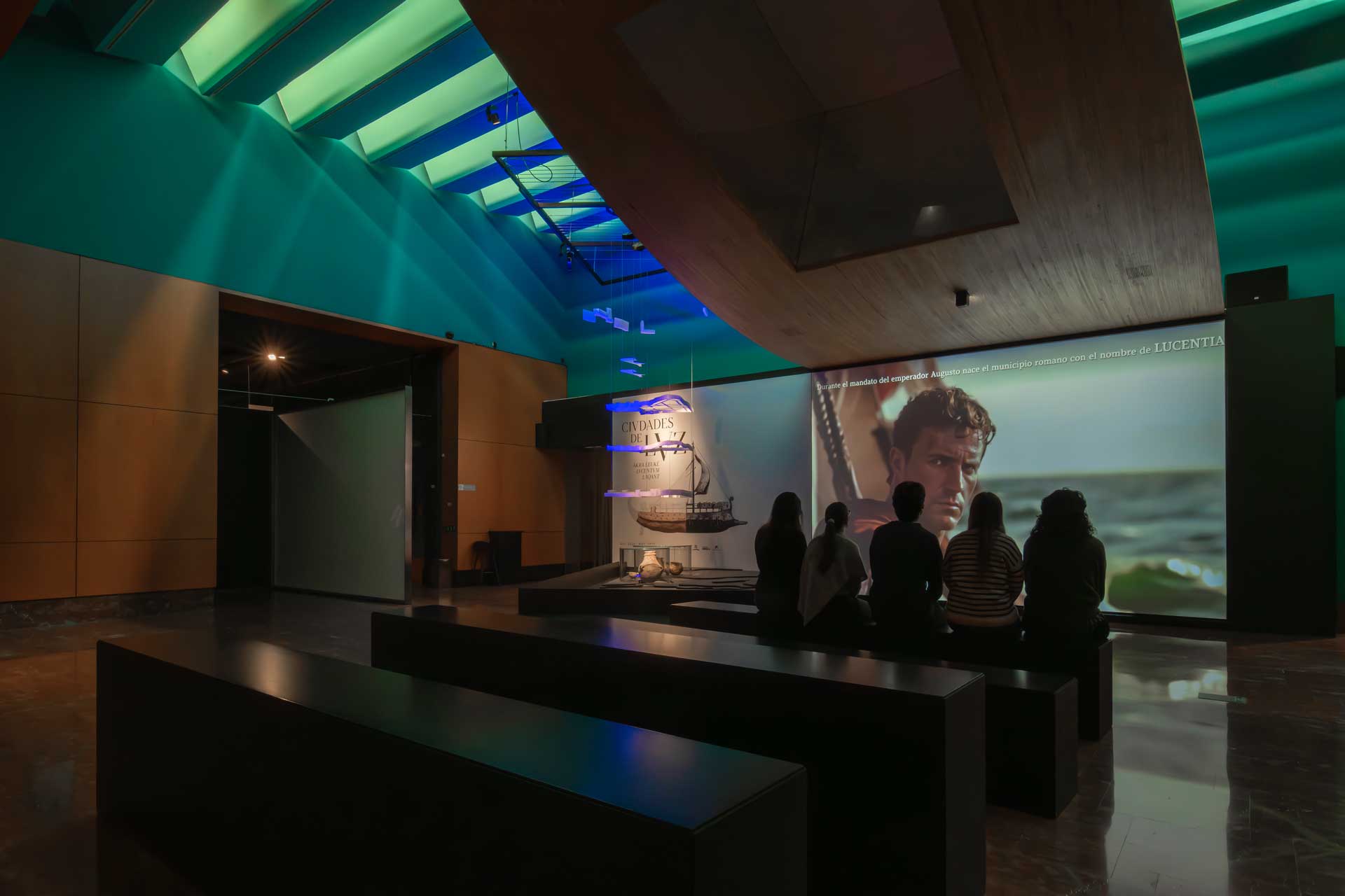 La sala 2, dedicada a Lucentum, recrea la ciudad romana mediante proyecciones envolventes, retratos generados por inteligencia artificial, cerámicas, monedas e inscripciones, destacando la “Mano del Emperador” y su reconstrucción parcial.