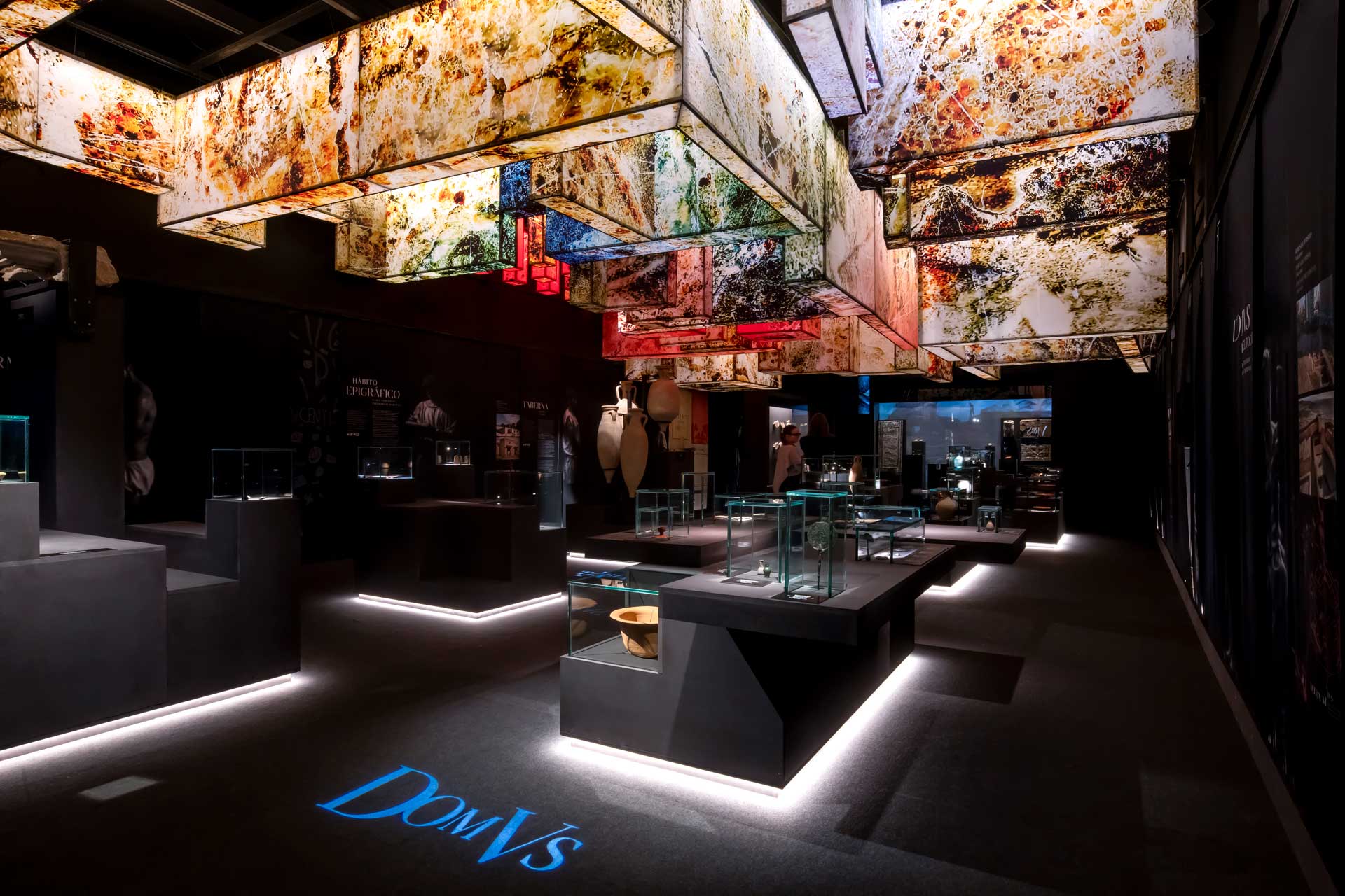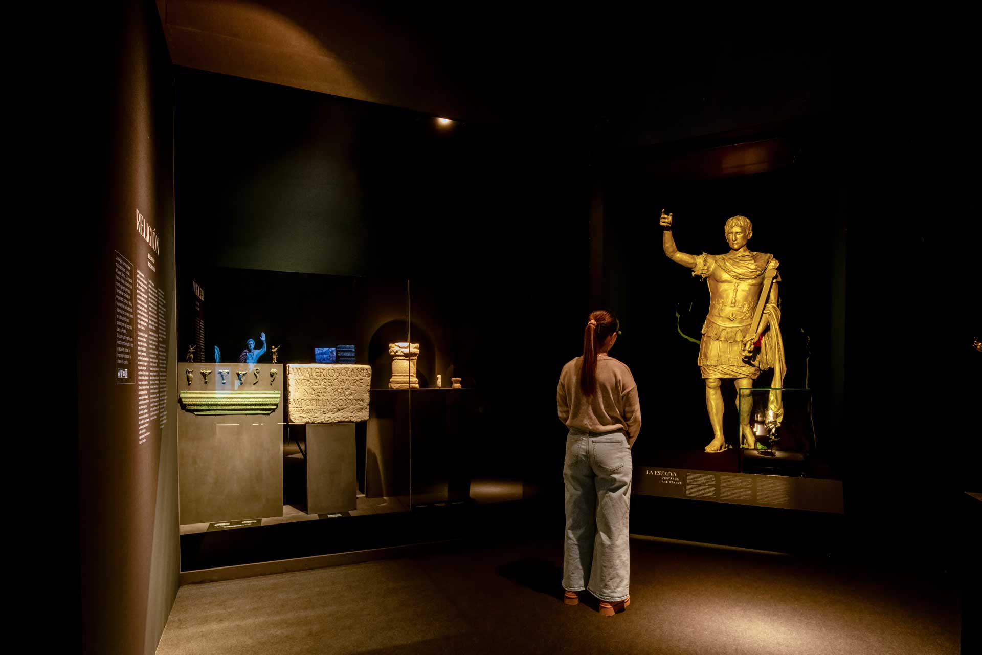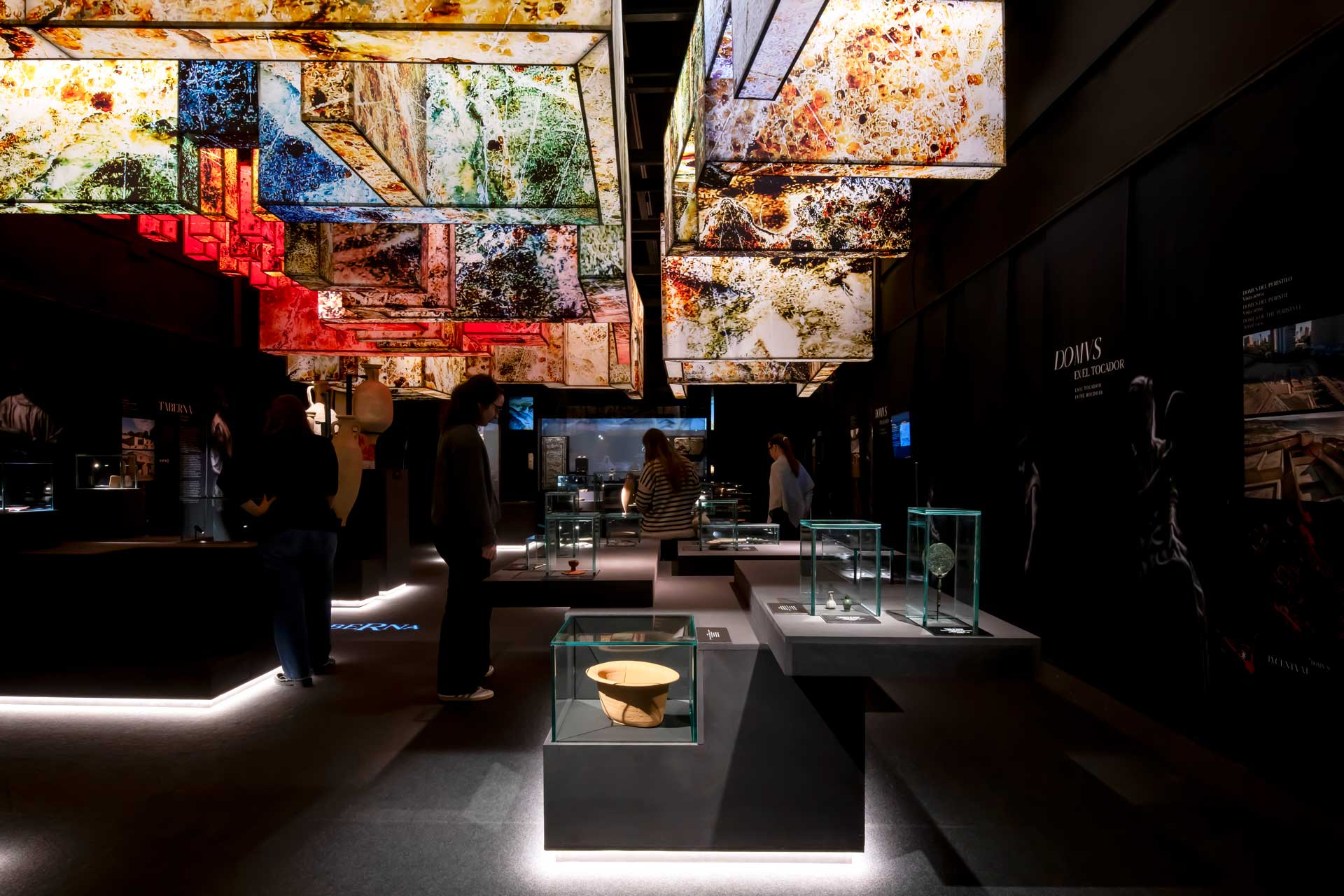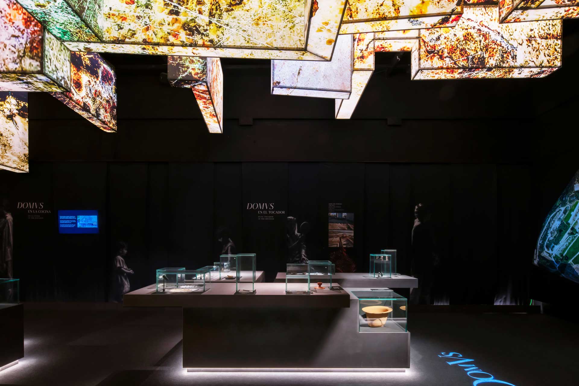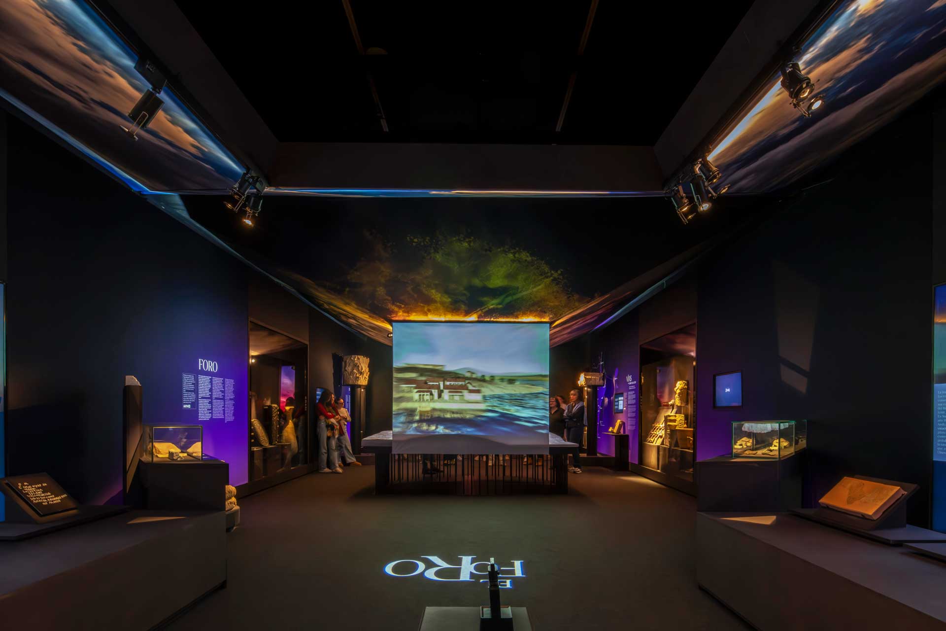La sala 2, dedicada a Lucentum, recrea la ciudad romana mediante proyecciones envolventes, retratos generados por inteligencia artificial, cerámicas, monedas e inscripciones, destacando la “Mano del Emperador” y su reconstrucción parcial.