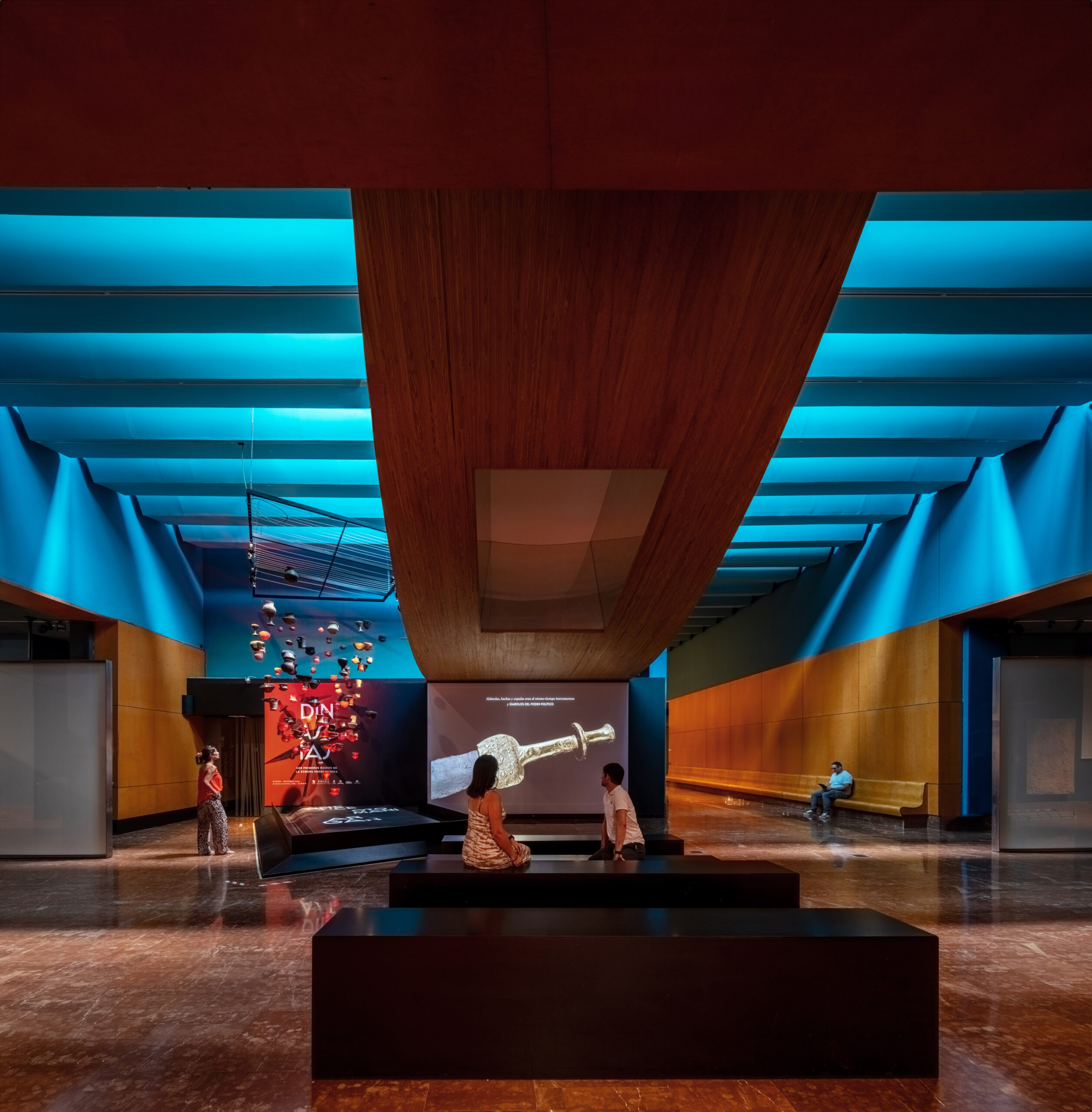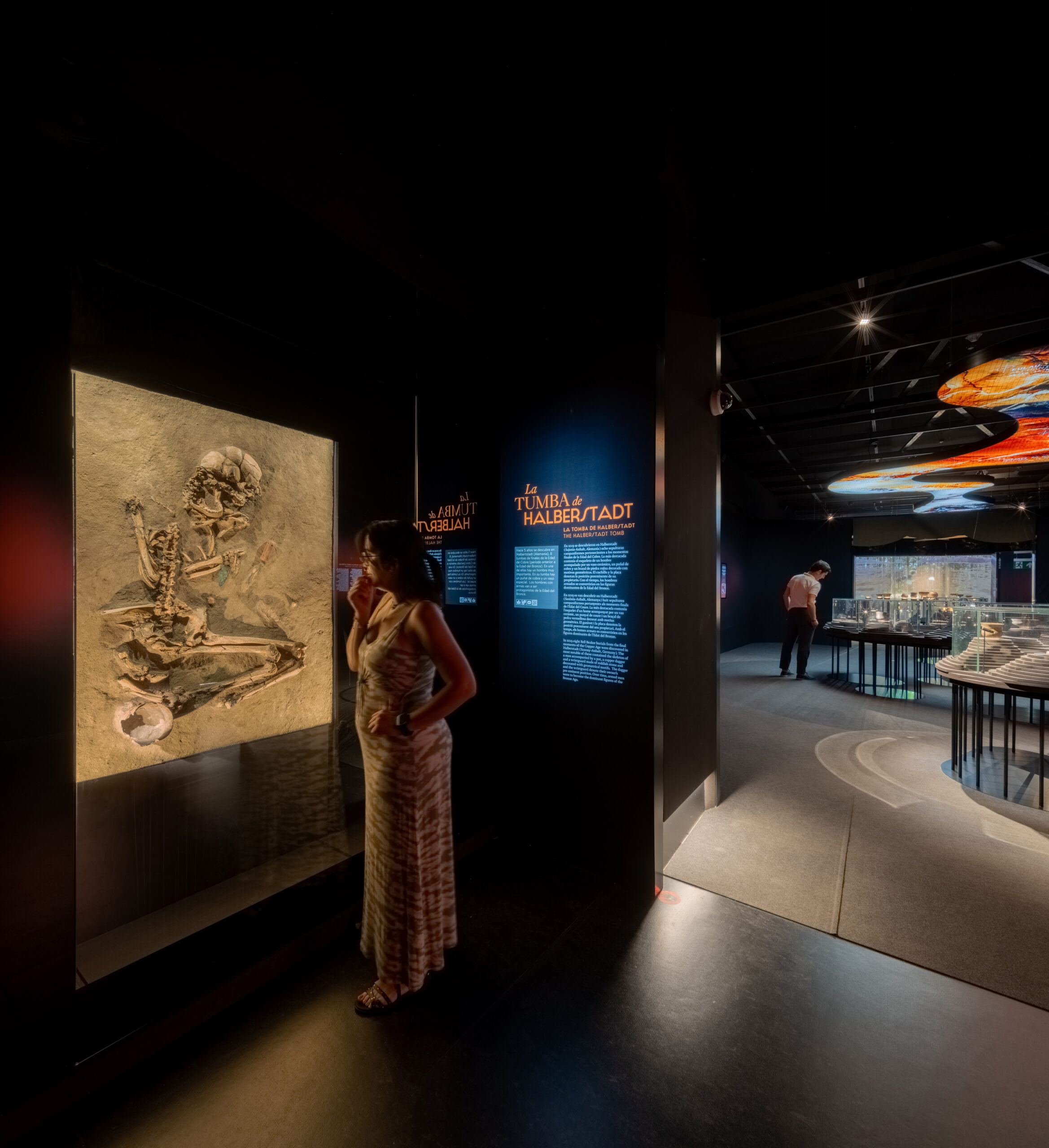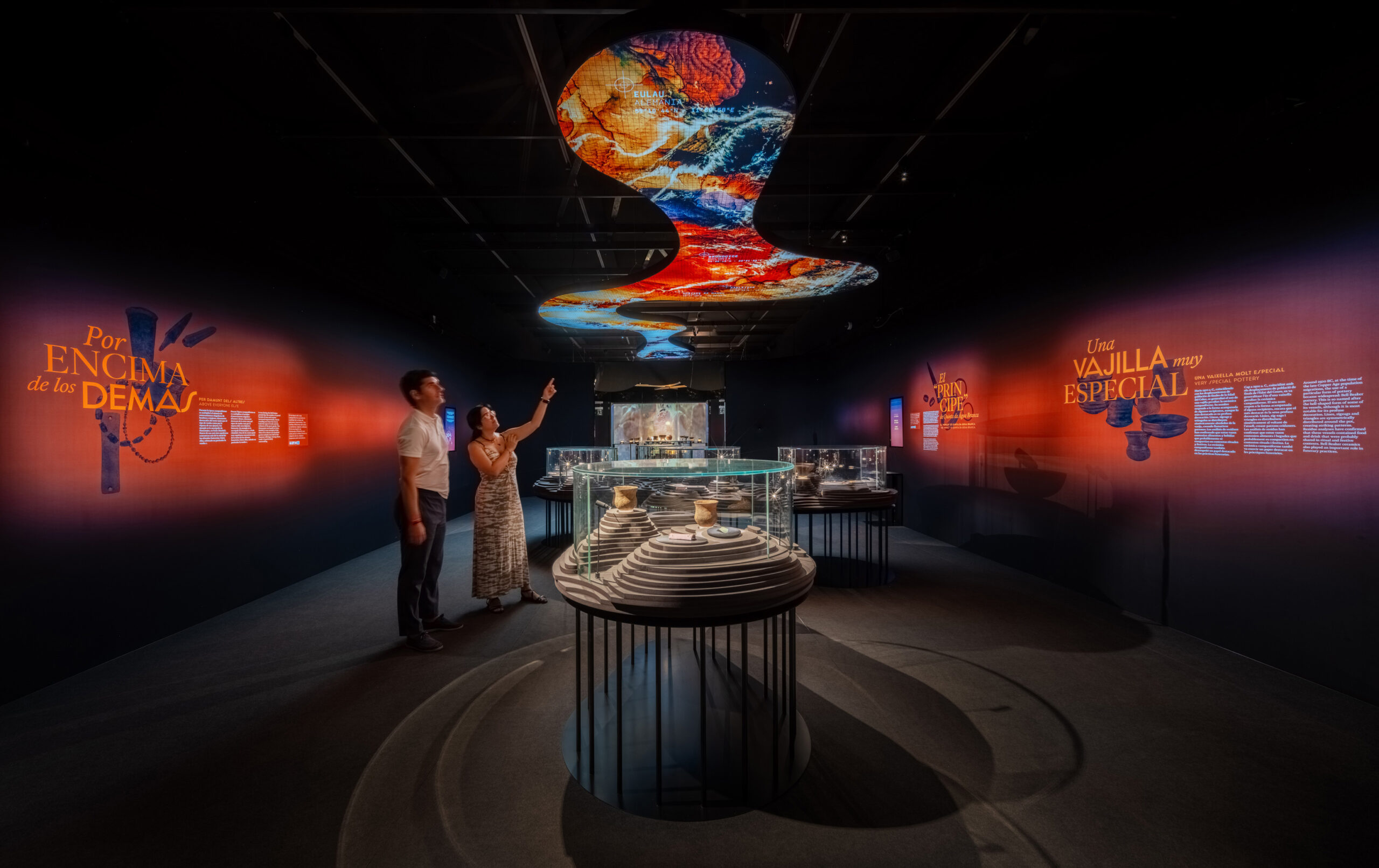 La sala 1 presenta una mesa topográfica y vitrinas circulares que muestran el territorio europeo durante la Edad del Cobre y las piezas clave de las culturas protagonistas. Gobos proyectan los nombres de cada grupo en el suelo, mientras instalaciones aéreas evocan la conexión entre culturas. En el ábside, el Ajuar del Túmulo de Leubingen se acompaña de un audiovisual.