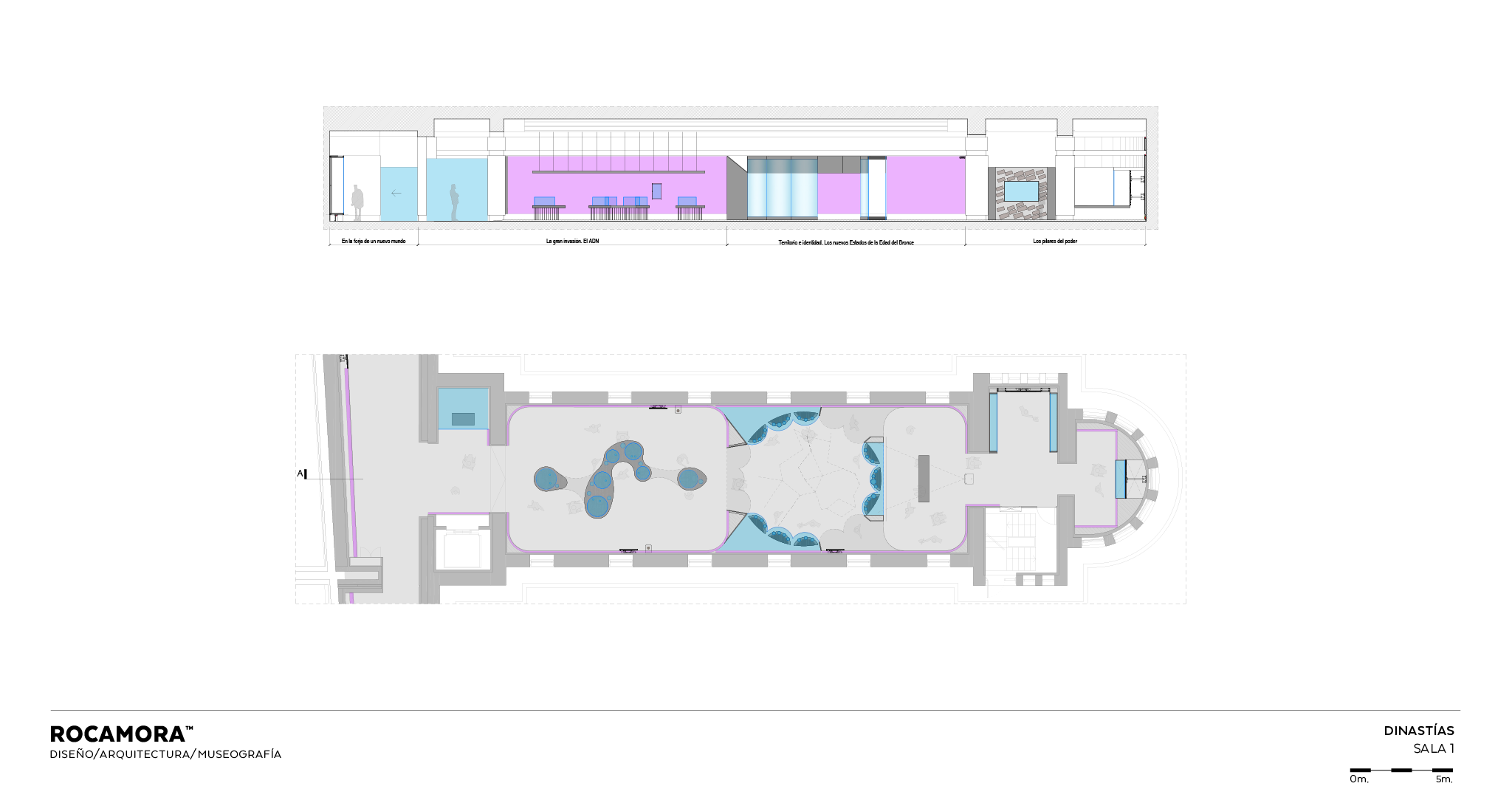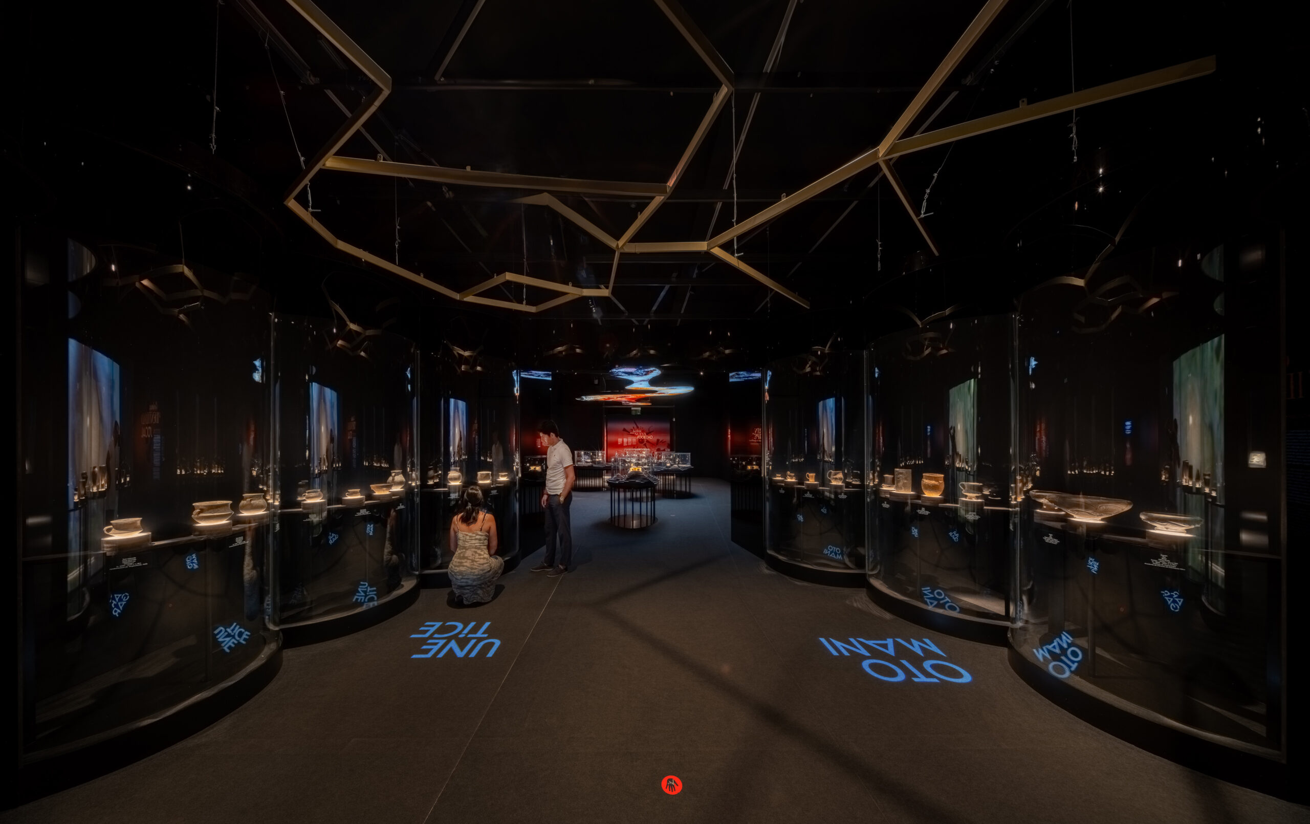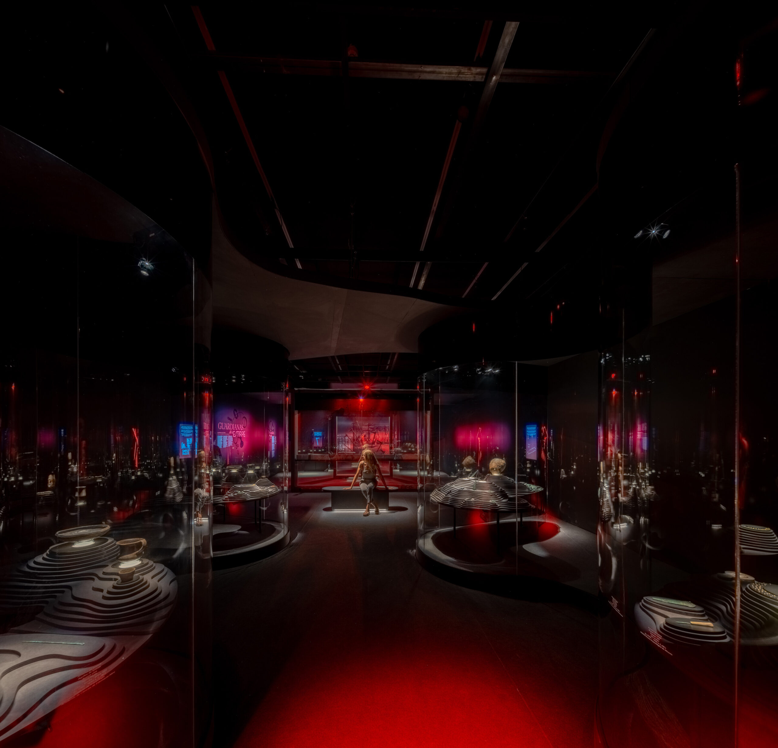 La sala 1 presenta una mesa topográfica y vitrinas circulares que muestran el territorio europeo durante la Edad del Cobre y las piezas clave de las culturas protagonistas. Gobos proyectan los nombres de cada grupo en el suelo, mientras instalaciones aéreas evocan la conexión entre culturas. En el ábside, el Ajuar del Túmulo de Leubingen se acompaña de un audiovisual.