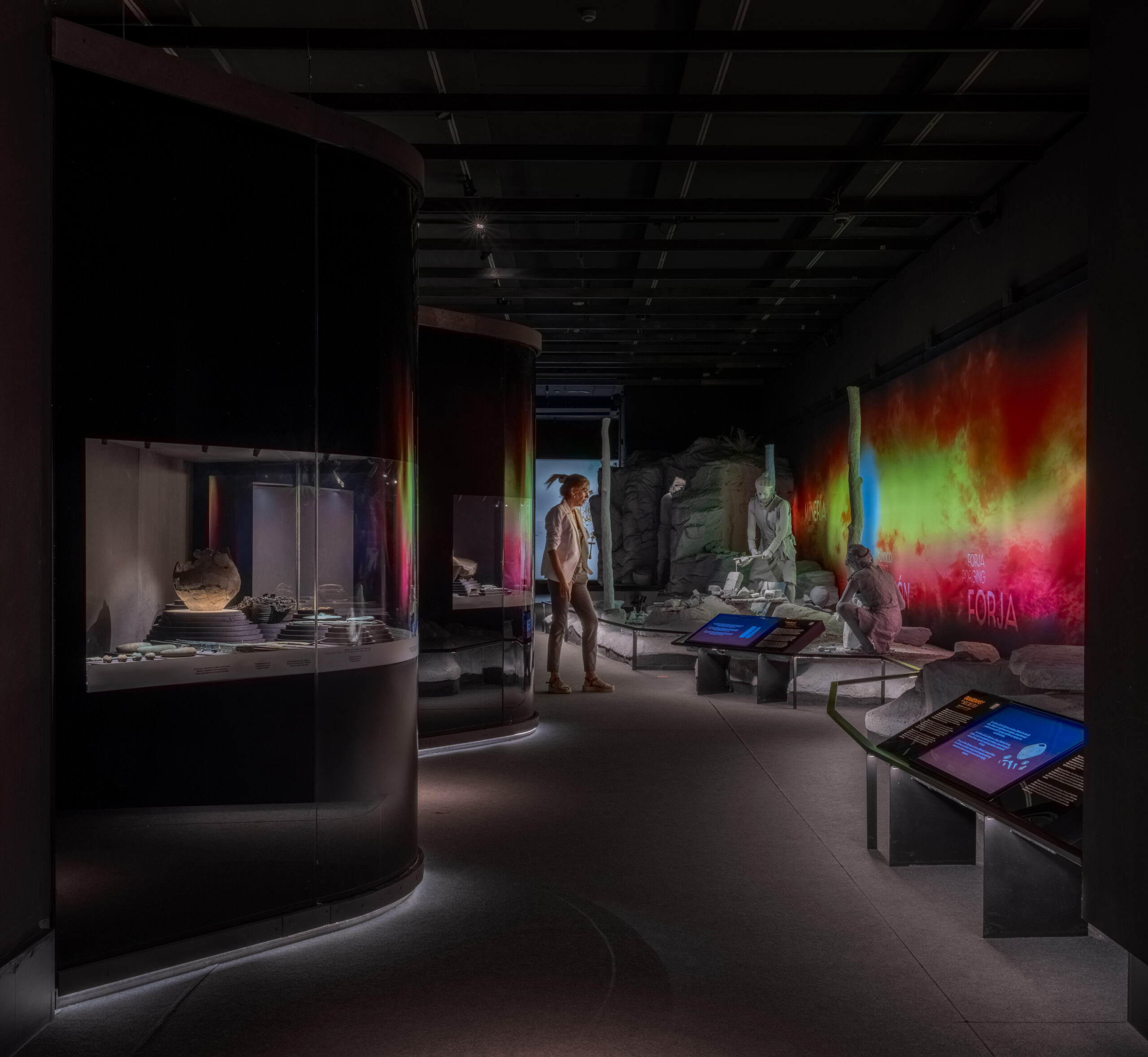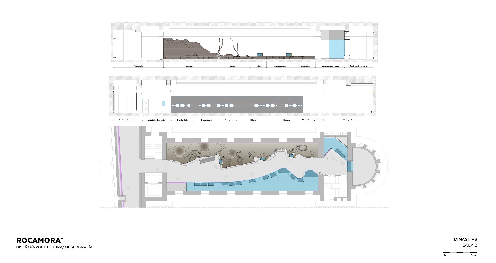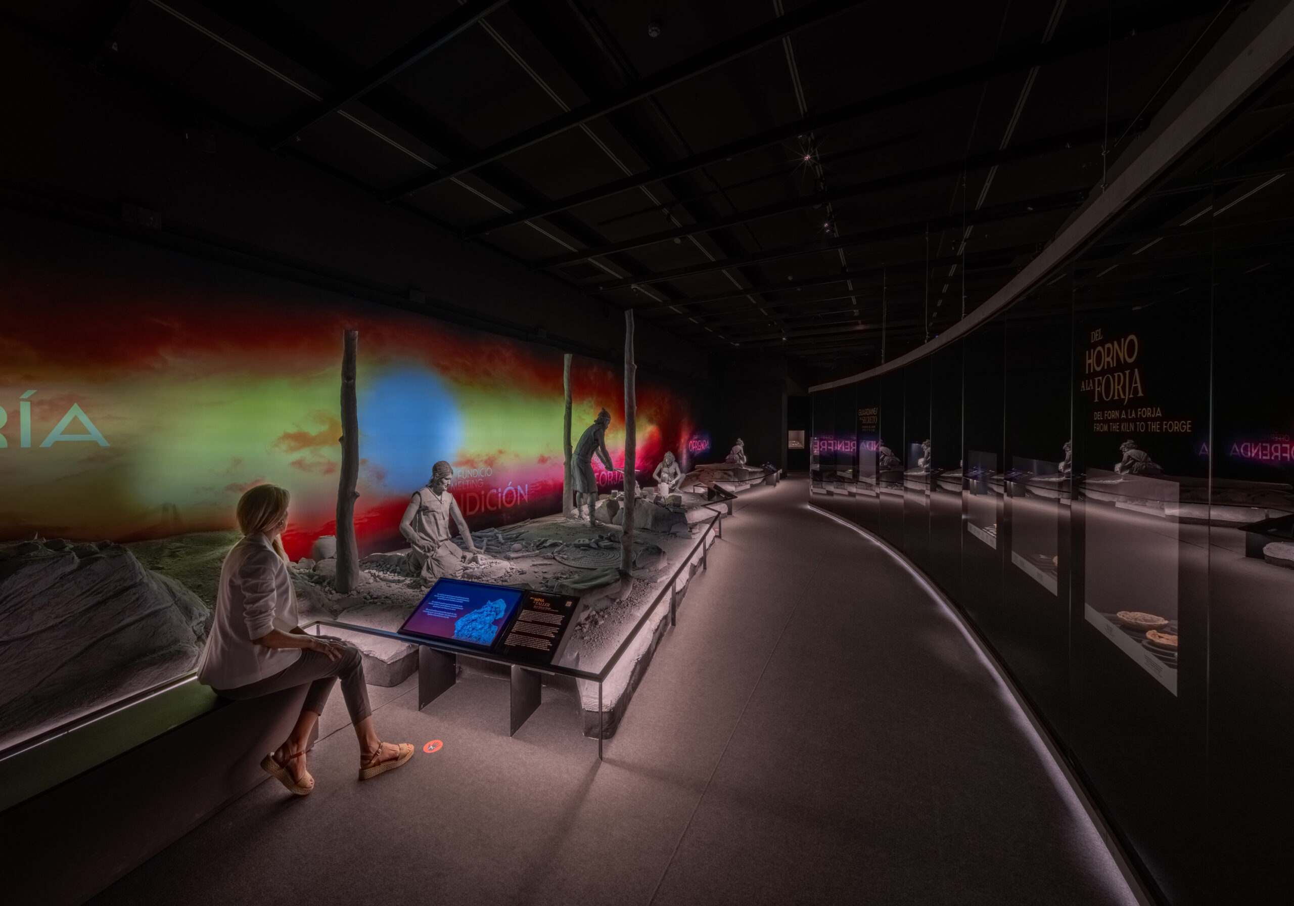 La sala 2 se organiza en dos gestos escenográficos: a la izquierda, un diorama hiperrealista muestra la extracción de minerales, fundición y uso ritual de los objetos; a la derecha, un arco espejado alberga piezas que dialogan con la escenografía. En el ábside, vitrinas de ámbar, oro y marfil se acompañan de un audiovisual y paisaje sonoro de Luis Ivars.