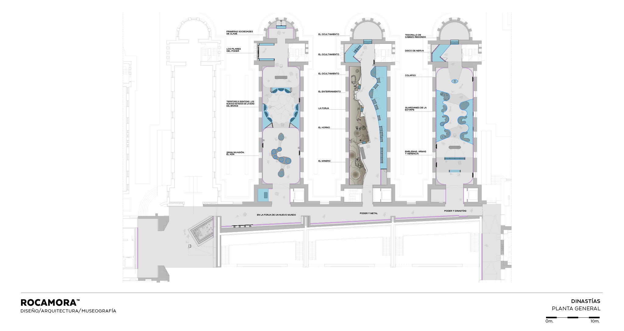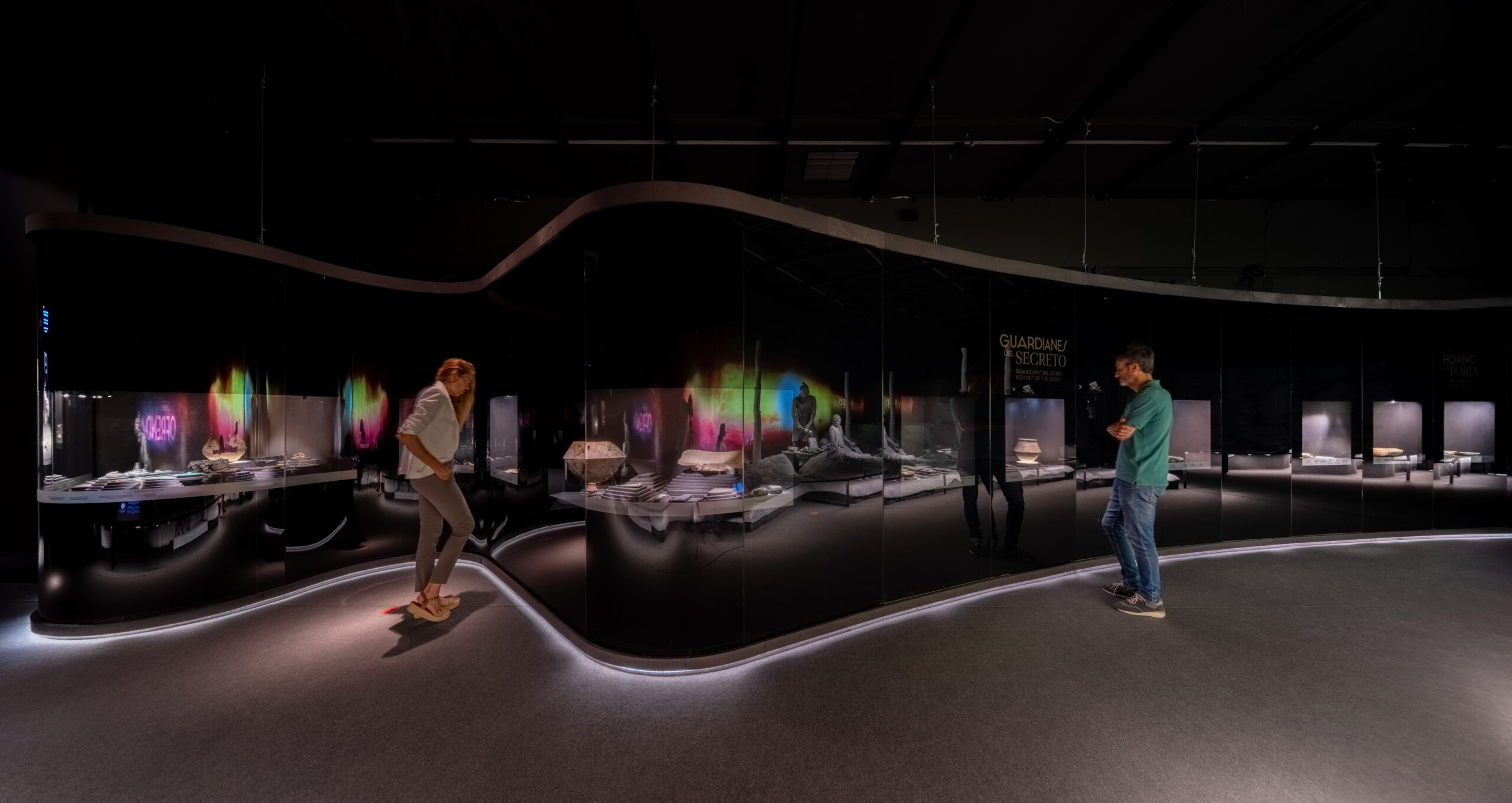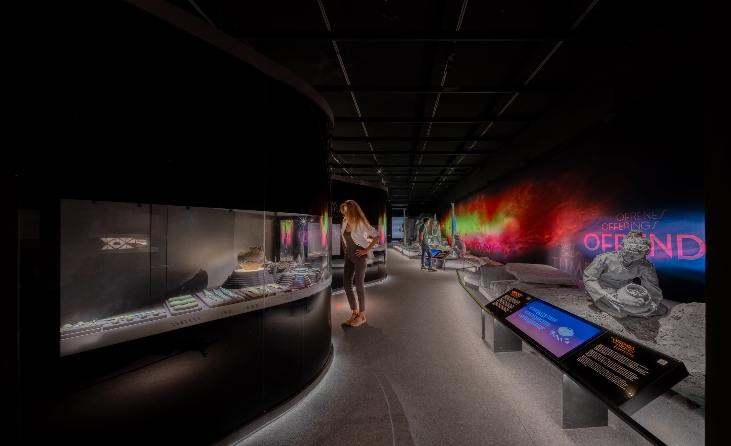 La sala 2 se organiza en dos gestos escenográficos: a la izquierda, un diorama hiperrealista muestra la extracción de minerales, fundición y uso ritual de los objetos; a la derecha, un arco espejado alberga piezas que dialogan con la escenografía. En el ábside, vitrinas de ámbar, oro y marfil se acompañan de un audiovisual y paisaje sonoro de Luis Ivars.