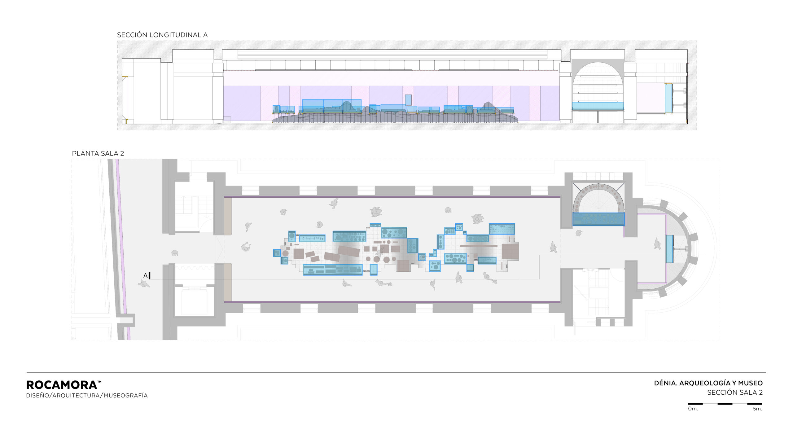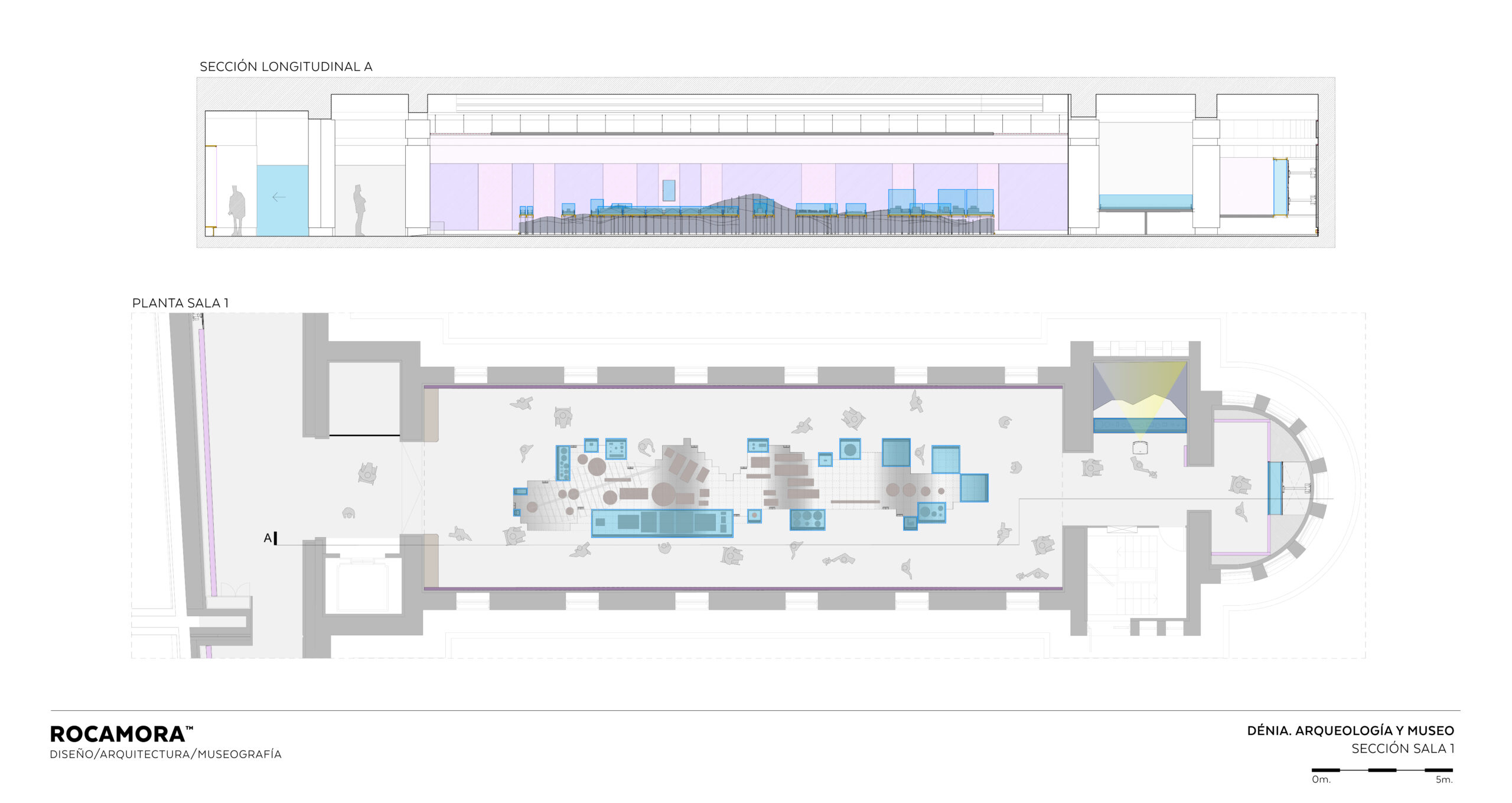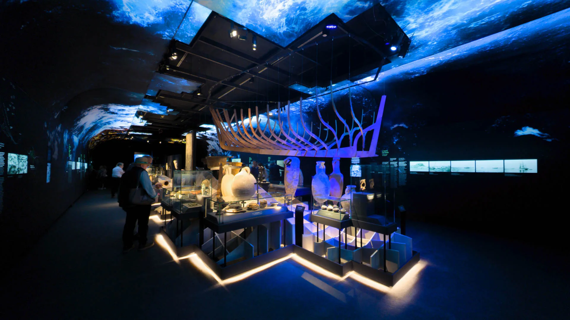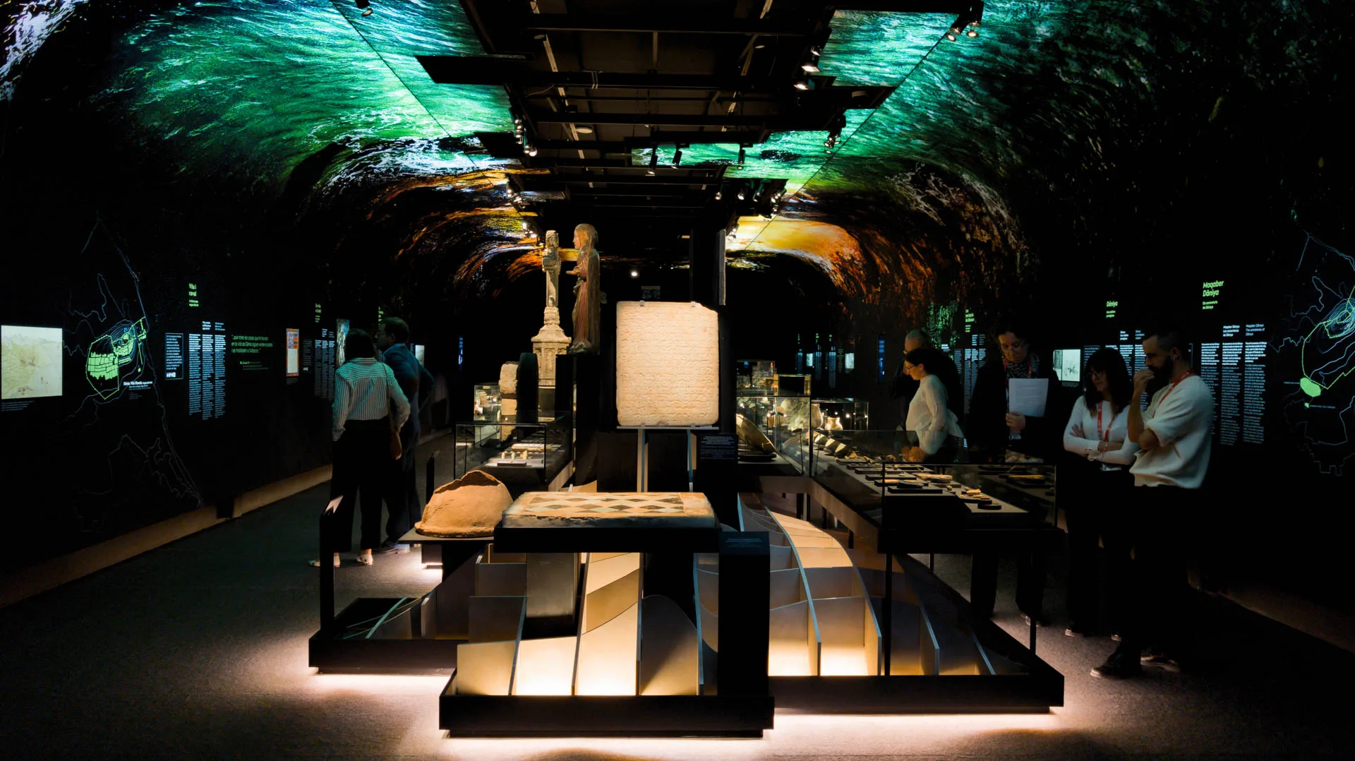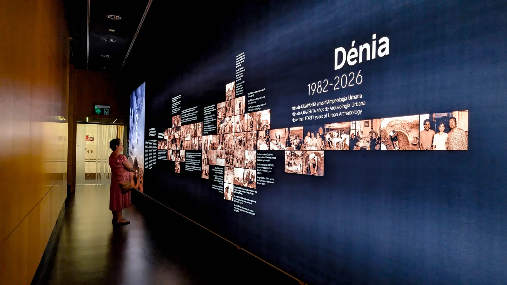 La exposición de Dénia conduce al visitante en un recorrido que transita del mar a la tierra, revelando la historia y la identidad de la ciudad. La primera sala recrea el Mediterráneo con barcos flotantes, bases que evocan olas y vitrinas con piezas arqueológicas, complementadas por un audiovisual de arqueología subacuática. La segunda sala se centra en la tierra, inspirada en la figura del Montgó, con estructuras de madera que simbolizan roca y relieve, organizando objetos que narran la vida en los asentamientos y la evolución histórica de Dénia. Tras un pasillo con galería fotográfica que rinde homenaje a quienes construyeron la memoria arqueológica, el recorrido culmina en un espacio minimalista con audiovisual final que conecta pasado, presente y futuro del patrimonio local.