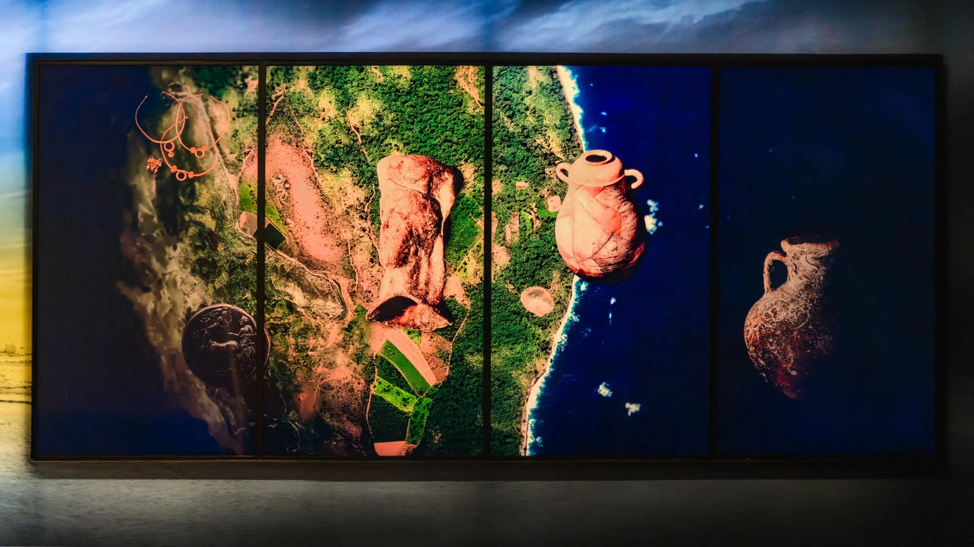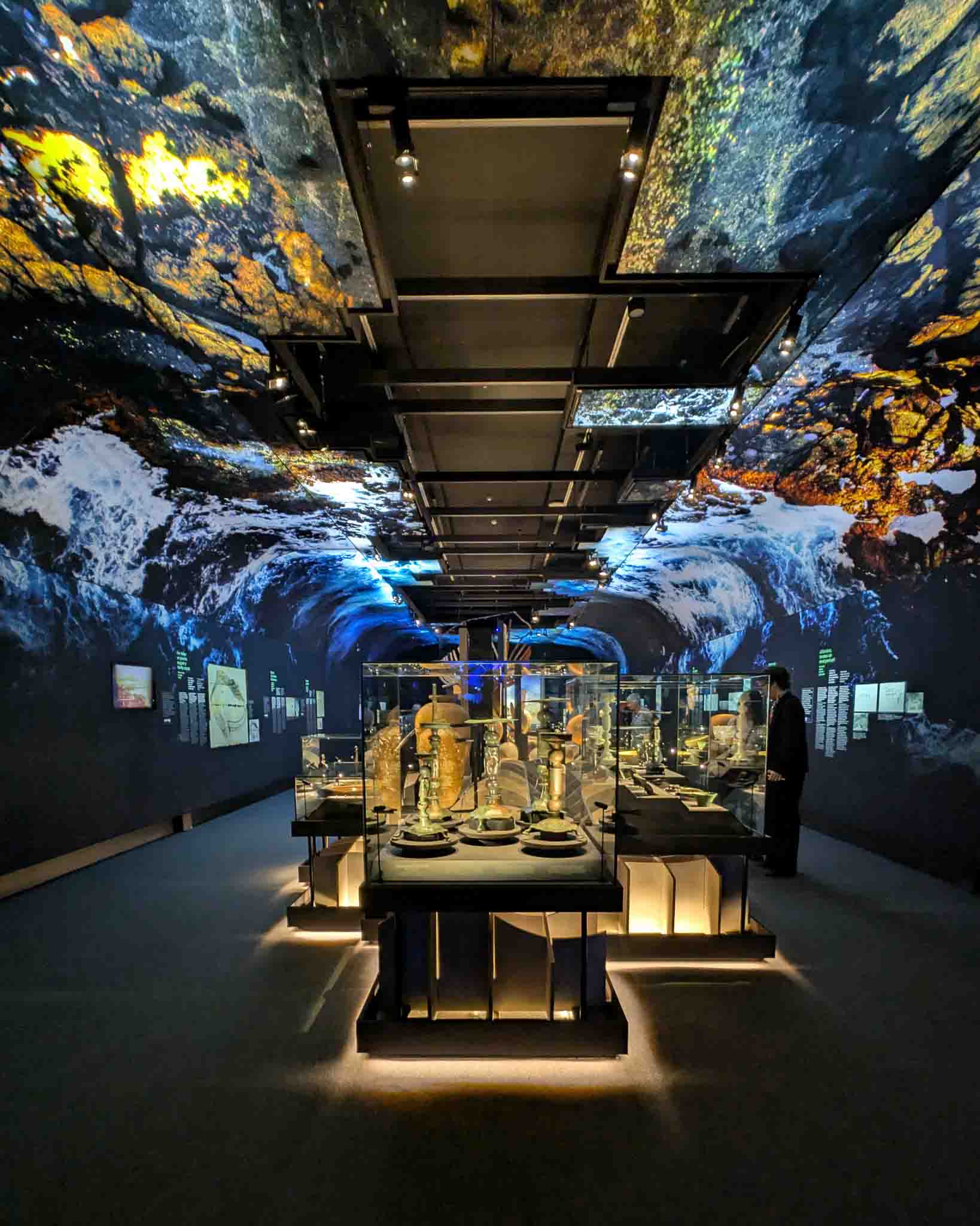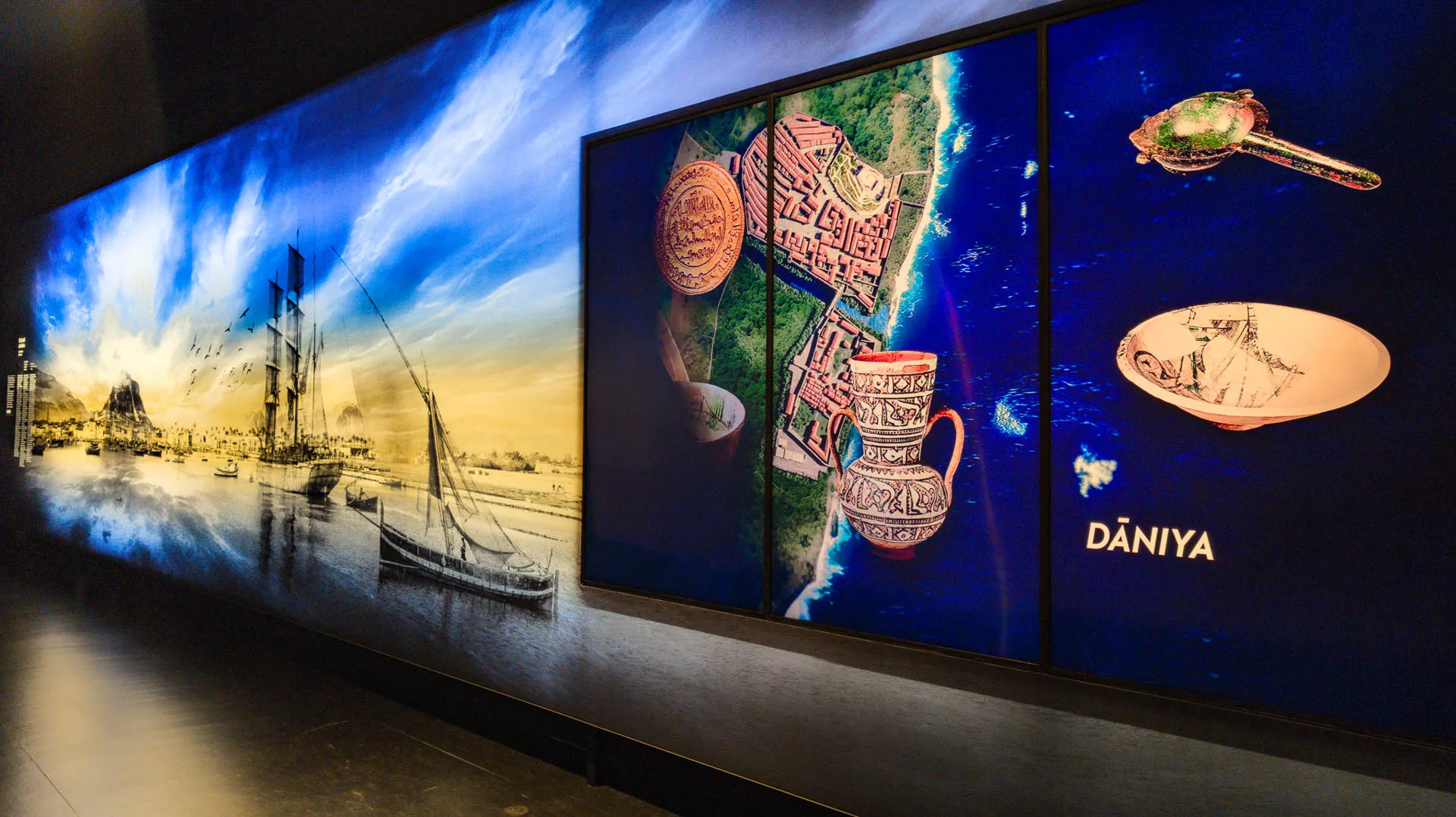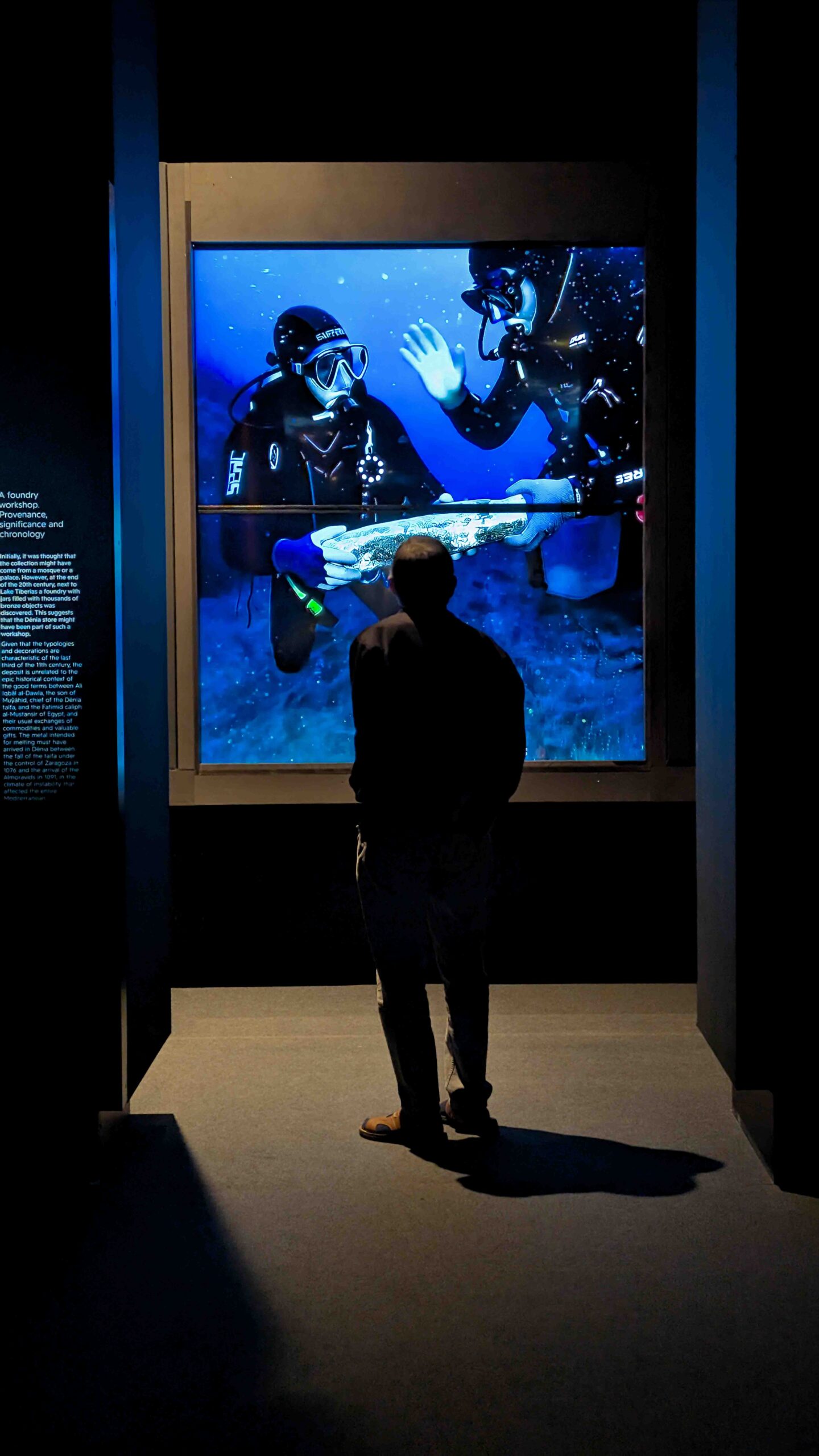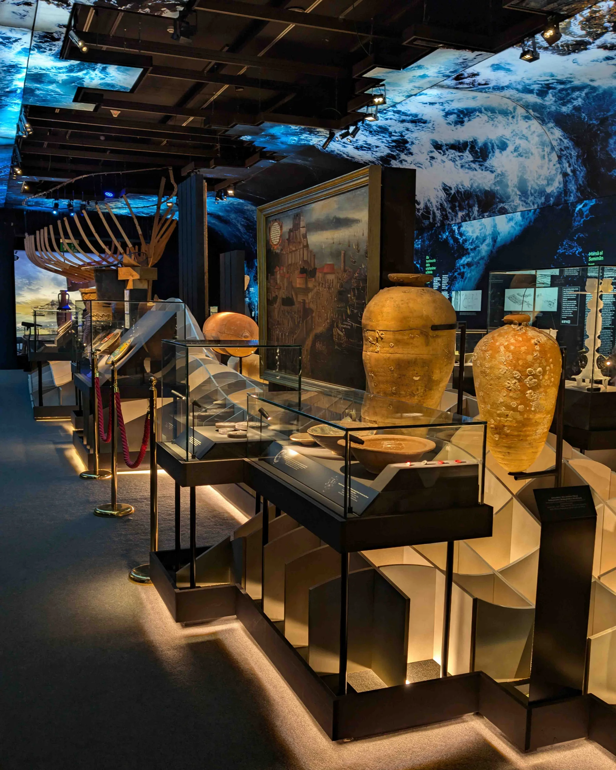 La exposición de Dénia conduce al visitante en un recorrido que transita del mar a la tierra, revelando la historia y la identidad de la ciudad. La primera sala recrea el Mediterráneo con barcos flotantes, bases que evocan olas y vitrinas con piezas arqueológicas, complementadas por un audiovisual de arqueología subacuática. La segunda sala se centra en la tierra, inspirada en la figura del Montgó, con estructuras de madera que simbolizan roca y relieve, organizando objetos que narran la vida en los asentamientos y la evolución histórica de Dénia. Tras un pasillo con galería fotográfica que rinde homenaje a quienes construyeron la memoria arqueológica, el recorrido culmina en un espacio minimalista con audiovisual final que conecta pasado, presente y futuro del patrimonio local.