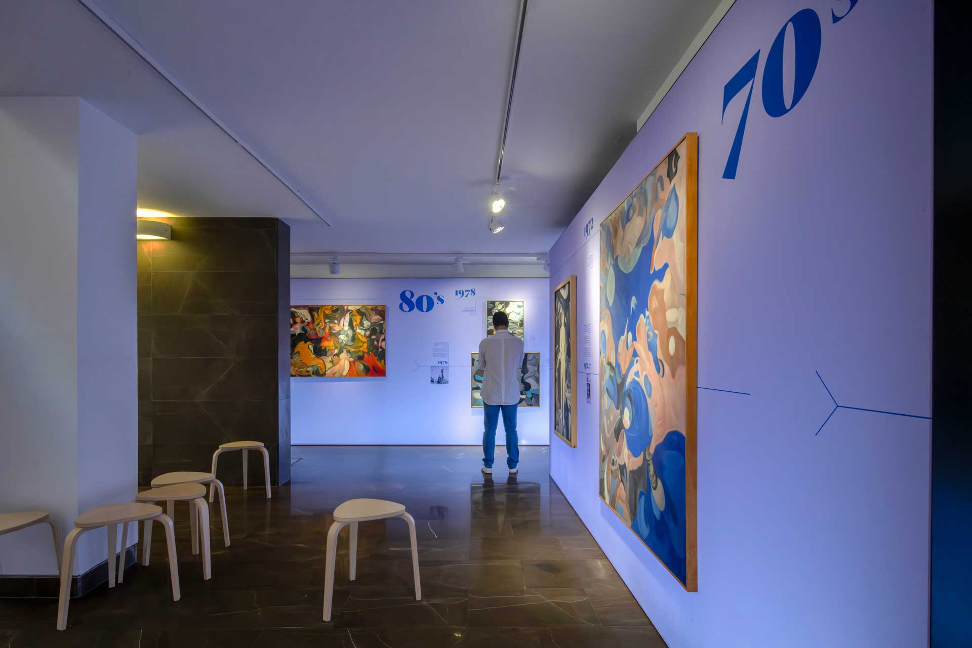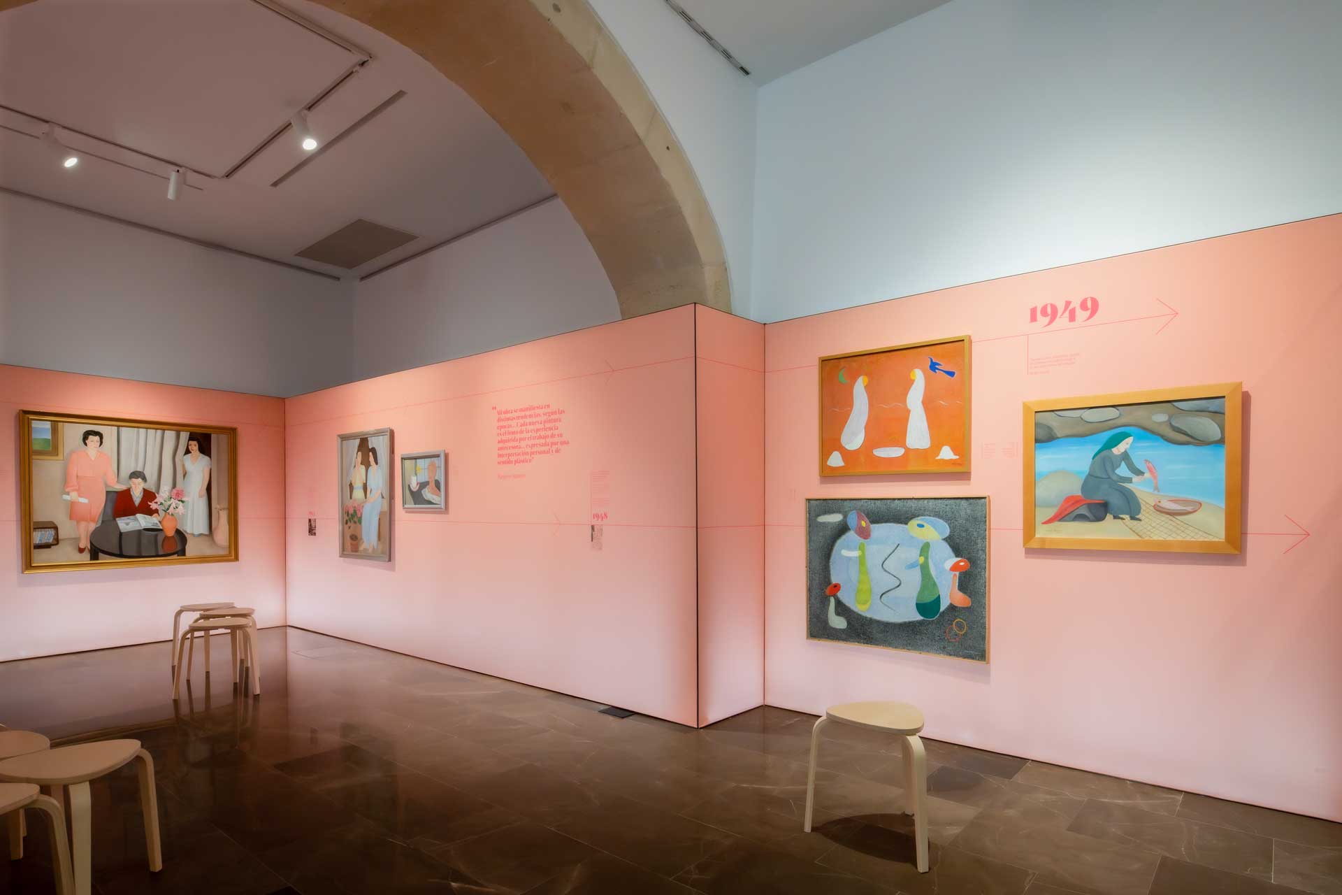 Uno de los aspectos originales de la exposición es el diseño del soporte expositivo ya que toda la información se recoge en una gráfica textil que aparece como un “lienzo continuo”: una galería visual en la que obras, dibujos, litografías y textos se integran en un recorrido fluido, organizado en una línea del tiempo donde se anotan etapas vitales del artista, así como referencias a su compañera museal, Josefa Fisac Martín (1909‑1989), cuya presencia es clave en el relato.